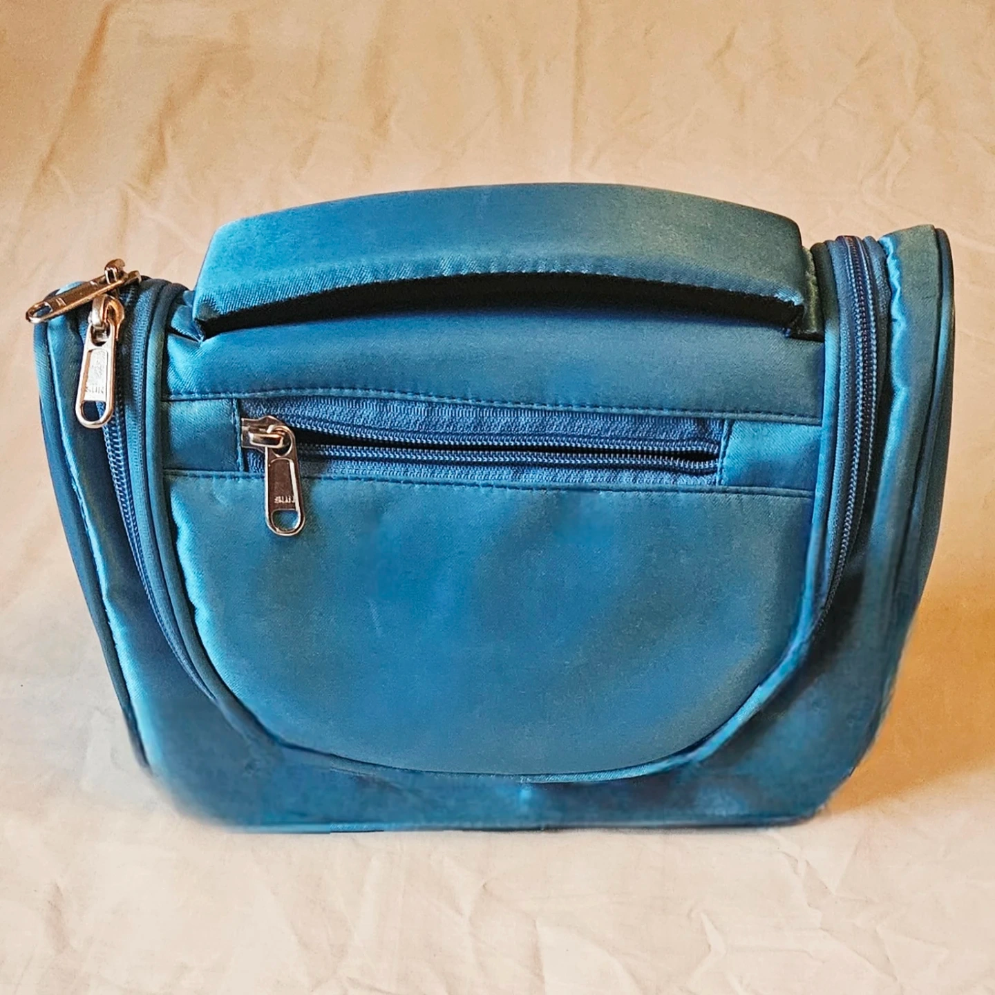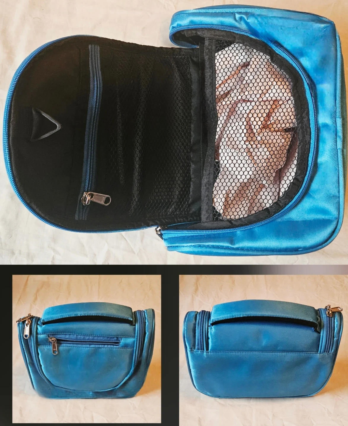Here's a handy blue toiletry bag, perfect for travel or keeping your bathroom organized! It features multiple compartments to keep all your essentials in place. It's in great condition and ready for a new home.