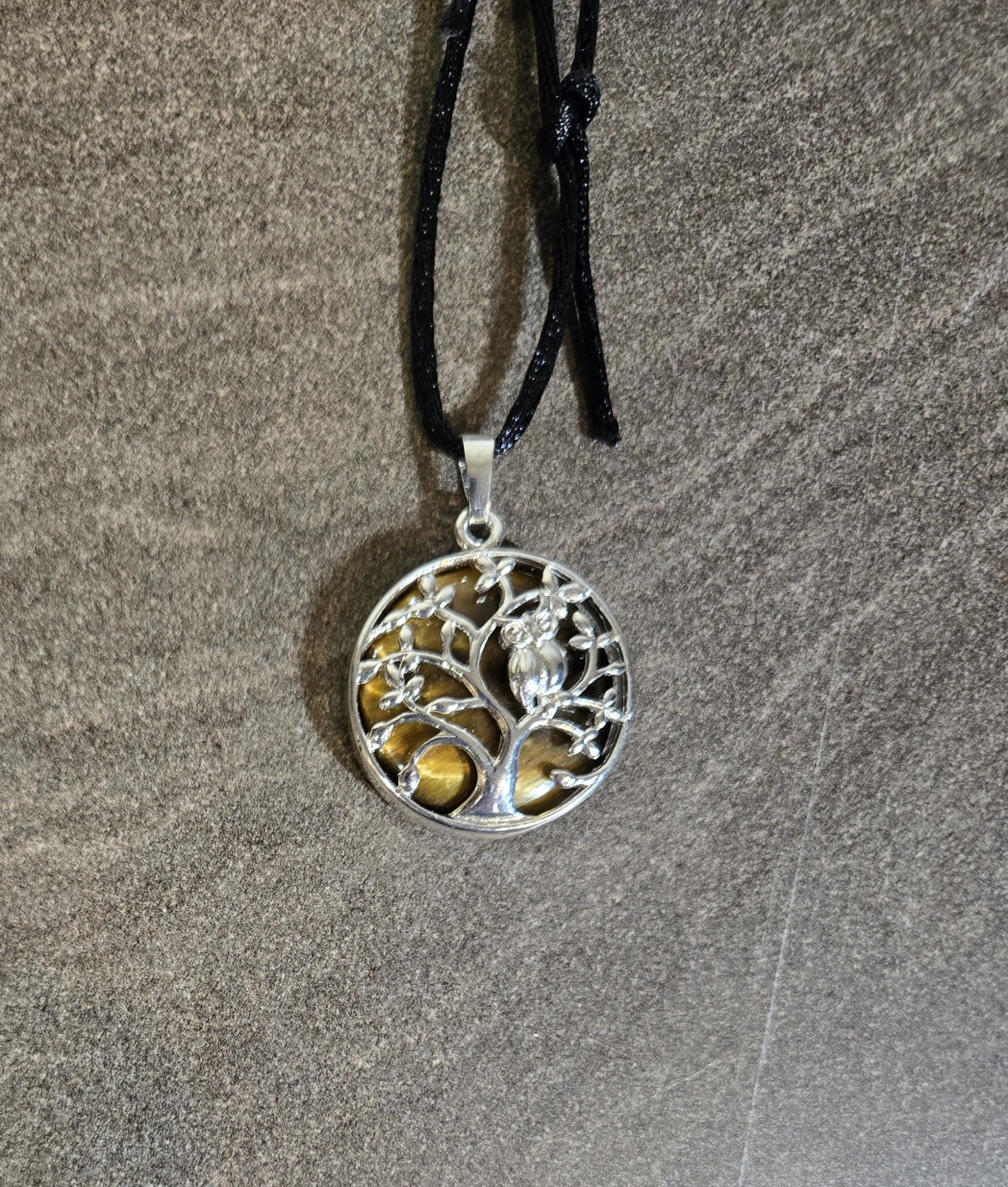 Final price drop. Like new. Pendant has a silver-tone design with a brown stone. There is an owl in the tree. Pendant is 1". Cross-posted.