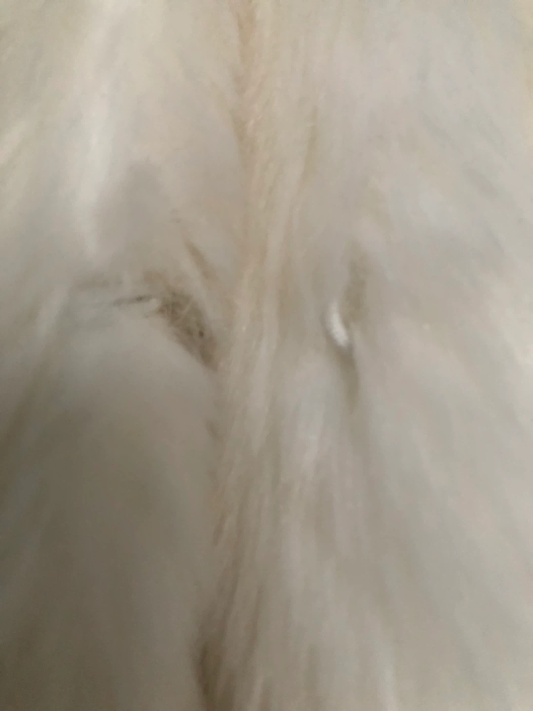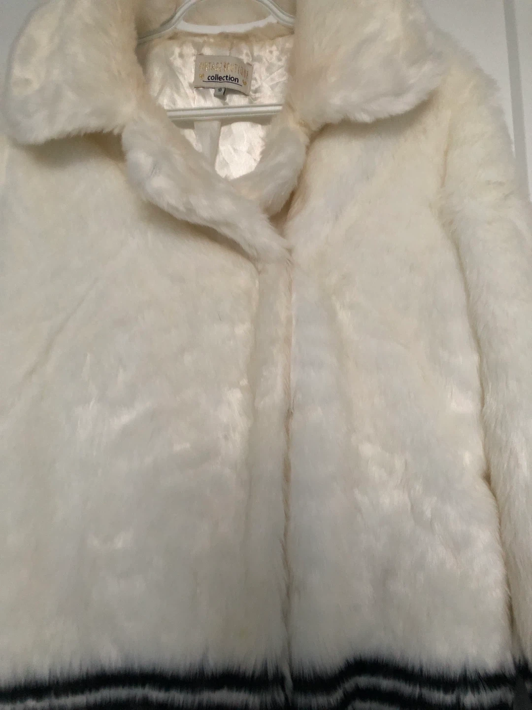 Selling a Vintage Boutique Collection faux fur coat in a size 10! It's a beautiful cream colour with black and grey striped detailing at the bottom. It has invisible hooks to button up. This coat is super soft and cozy, perfect for adding a touch of vintage glam to your wardrobe