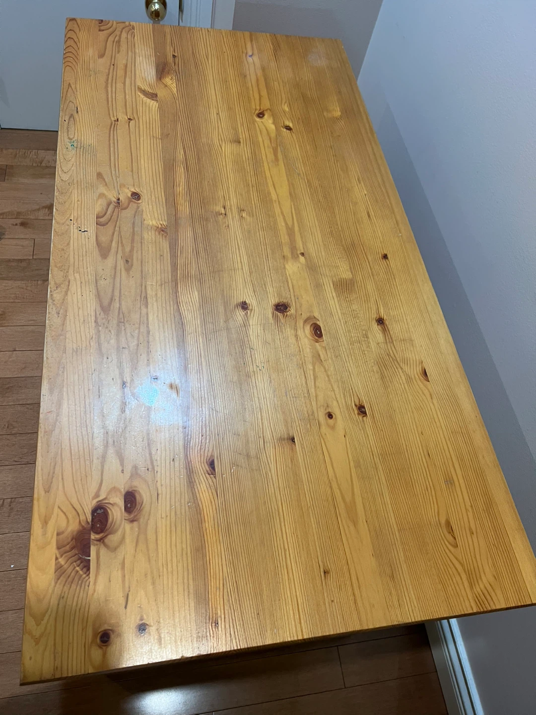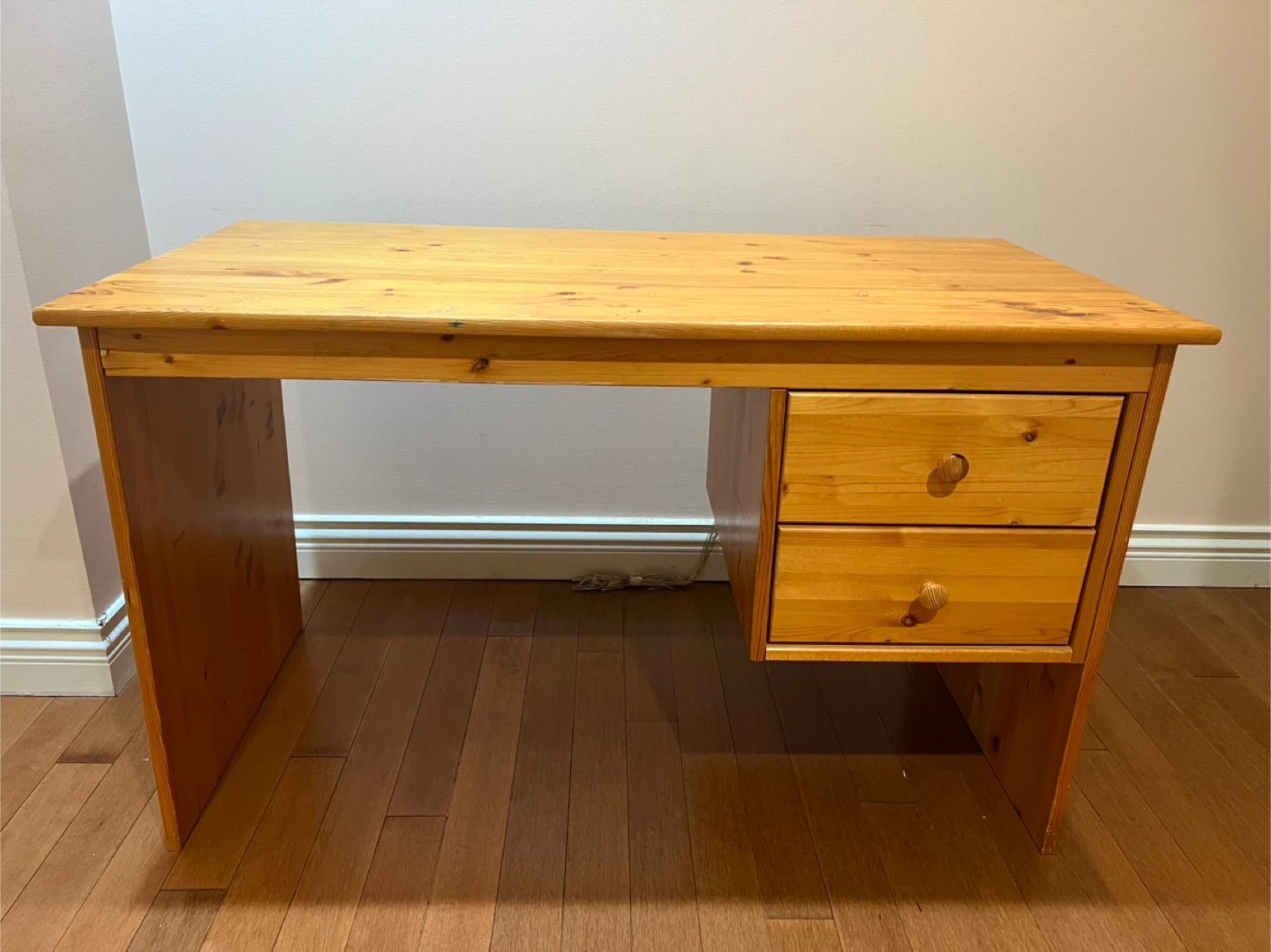 Selling a wooden desk featuring two drawers. It's perfect for a home office or study space for kids. There are some minor signs of use, as shown in the pictures. It’s ready for a new home as we are moving.
