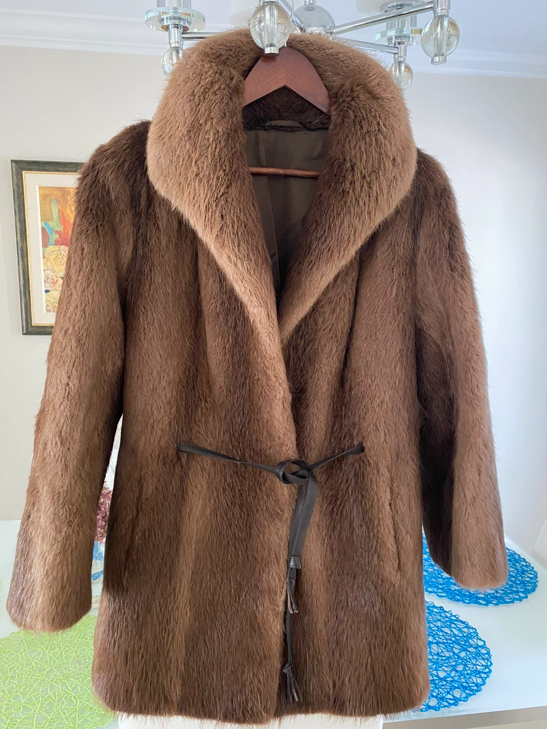 Selling a lovely brown fur coat. It comes with a leather tie to cinch the waist. It's in great condition. The length is just above a foot the knee!