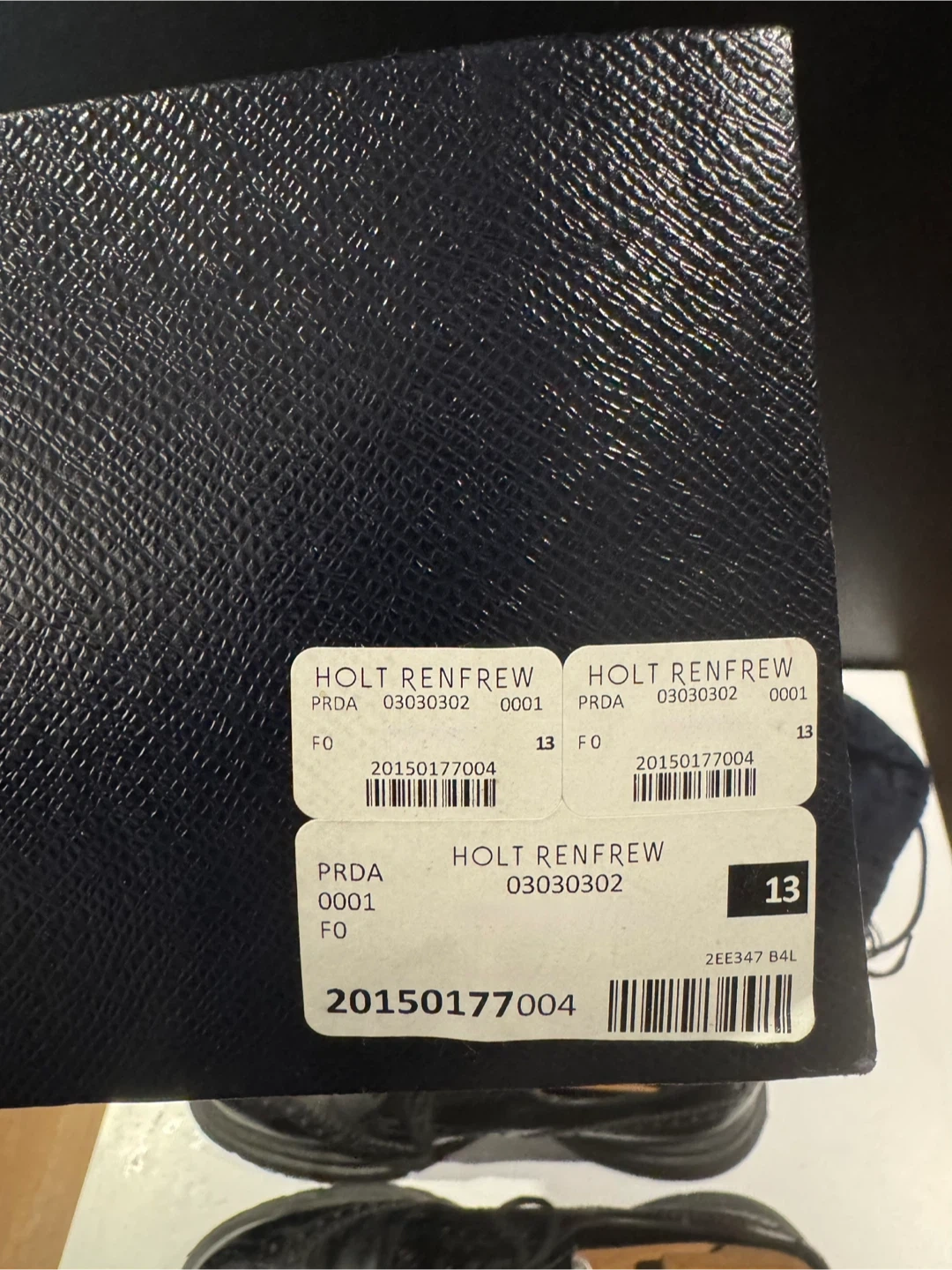65Selling a pair of Prada Calzature Uomo shoes in black leather! They are size 13. The box is included, along with the original packaging and documentation bought from holt renfrew still have online receipt on my account.