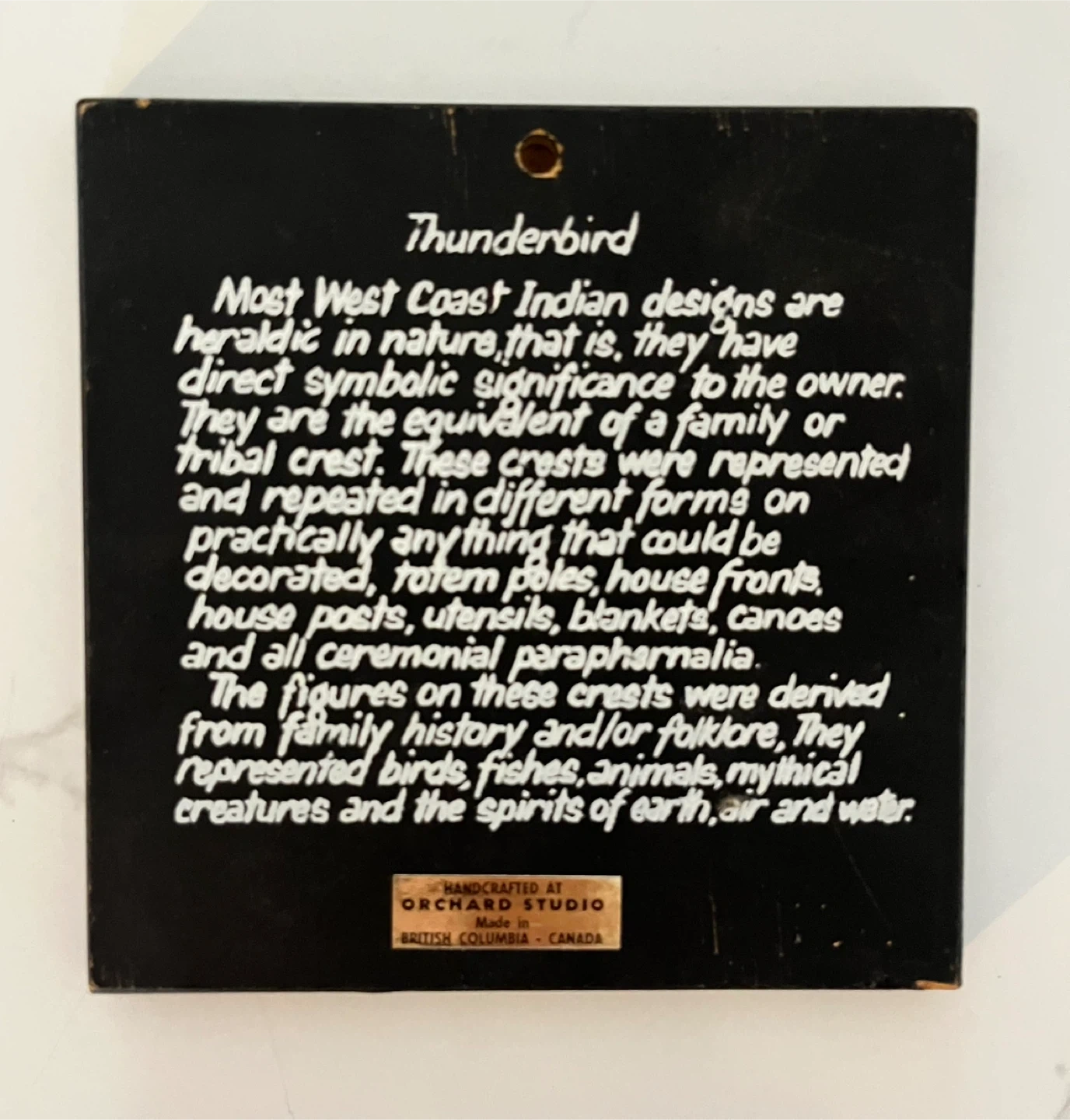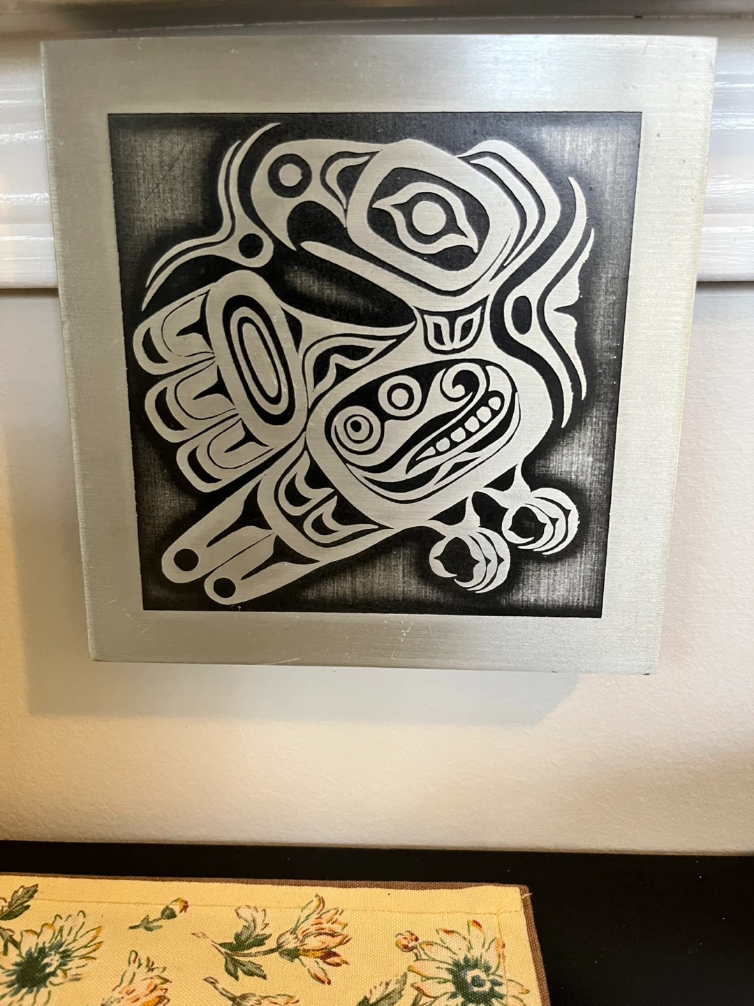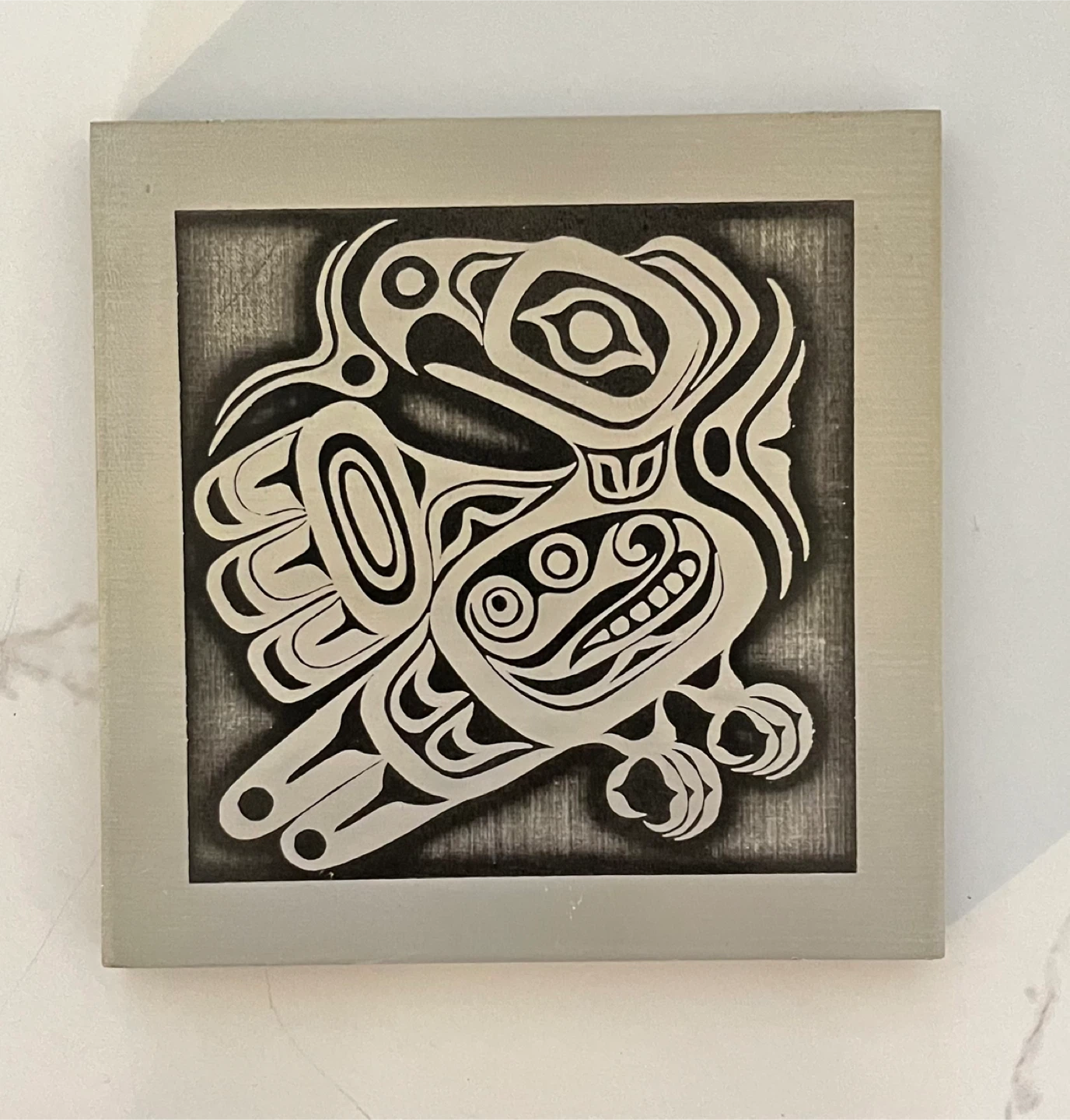 Spruce up your living space with this unique piece of Indigenous tile art! This beautiful tile features a Pacific Northwest Indigenous design, perfect for adding a touch of cultural elegance to any room. Being that it is a used item, it has a slight patina that gives it character.