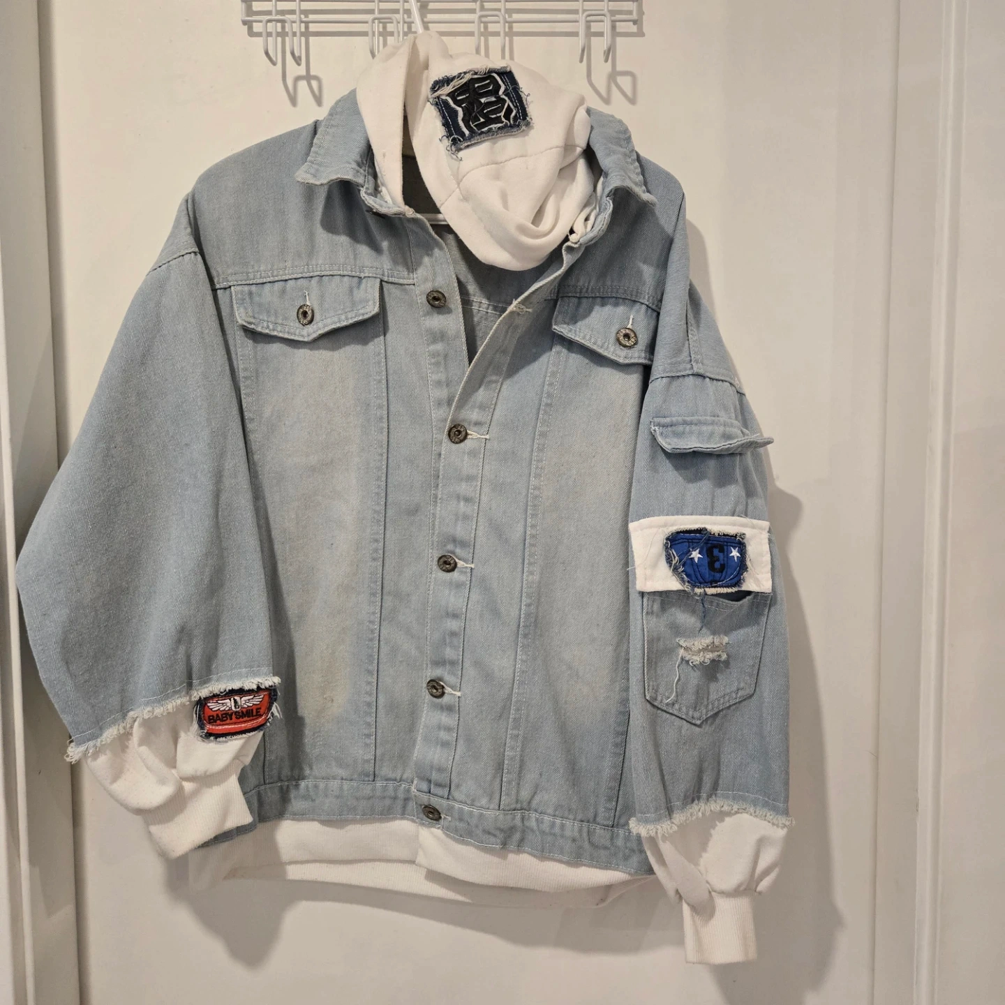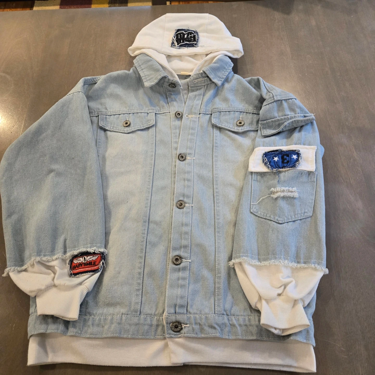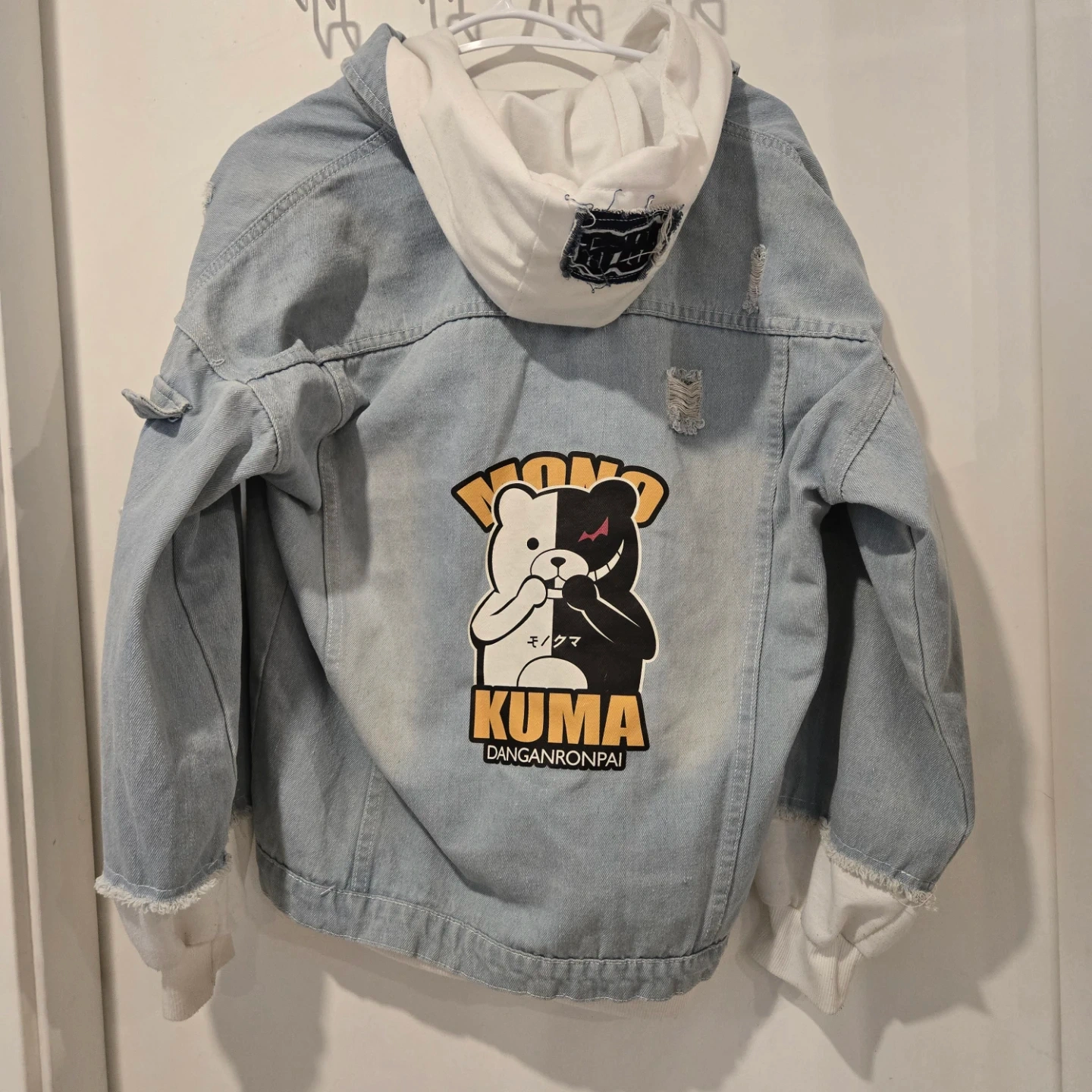 Monokuma Danganronpai denim jacket with a hoodie! It's in great condition, and the size is Large Please refer to the size chart in the photos for measurements!