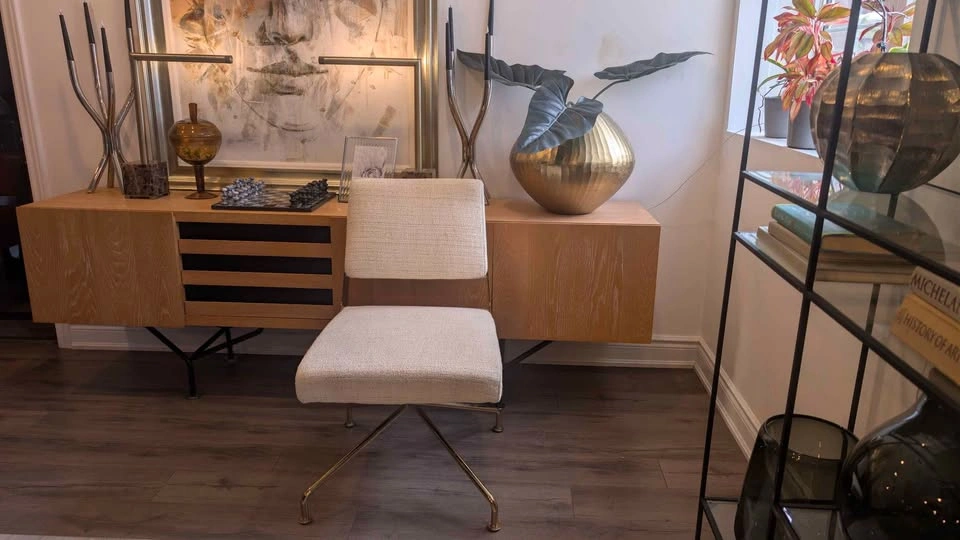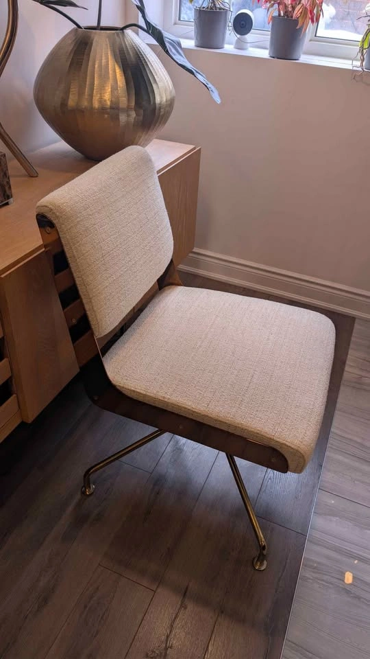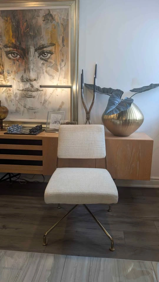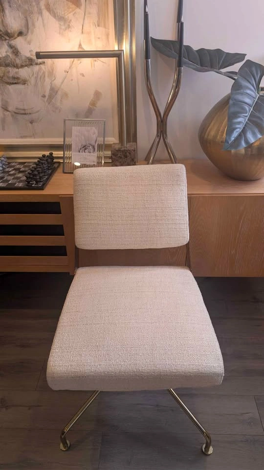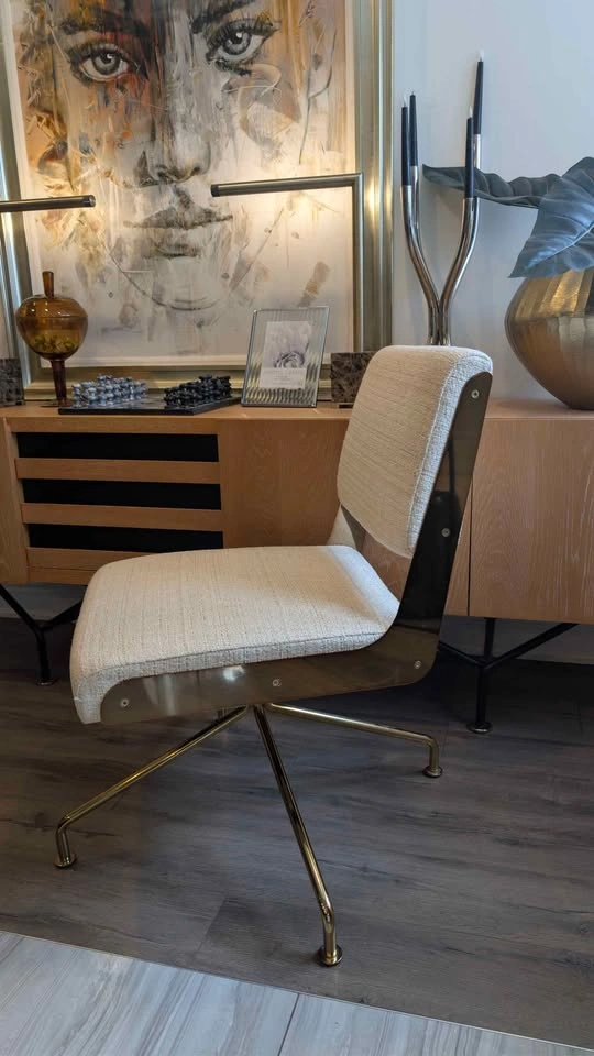 Inject some fashion sense into your 9-5. Designed by Mermelada Estudio, seat pays tribute to the glam life of Paris in the '50s. Stylish nubby-blended fabric complements sleek brass-plated frame without stealing the show. No need for casters when you look this chic.