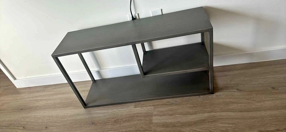 The Moment Entryway Bench was created exclusively for Design Collab— a CB2 collaborative that brings us together with like-minded souls and design institutions. Design Collab No. 1 debuts small–space solutions by 12 students in the Designed Objects curriculum at the School of the Art Institute of Chicago (SAIC). SAIC student Jacob Lenard recognizes that "small dwellings sometimes lose the ability to welcome one into a space with no formal entryway. The Moment bench allows "temporary moments of transition." Hand painted in an industrial silver-grey, this open frame-in-frame construction of iron tube and metal organizes shoes in the entry—from flip flops to tall rain boots. The middle shelf suspends a geometric nook for smaller items while the top ledge offers a spot to sit.