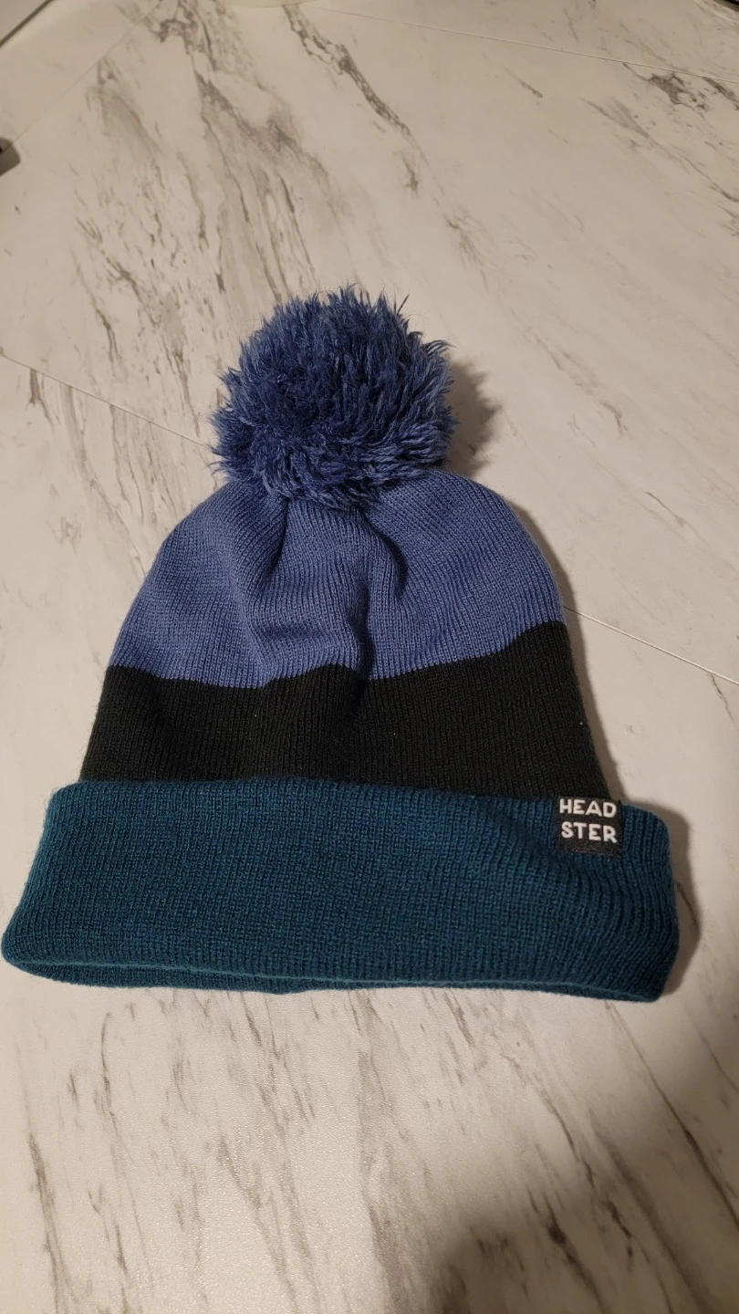 Cozy Headster toque in a cool colour block design! It features blue, black, and teal sections with a cute pompom on top. Perfect for keeping warm this winter!