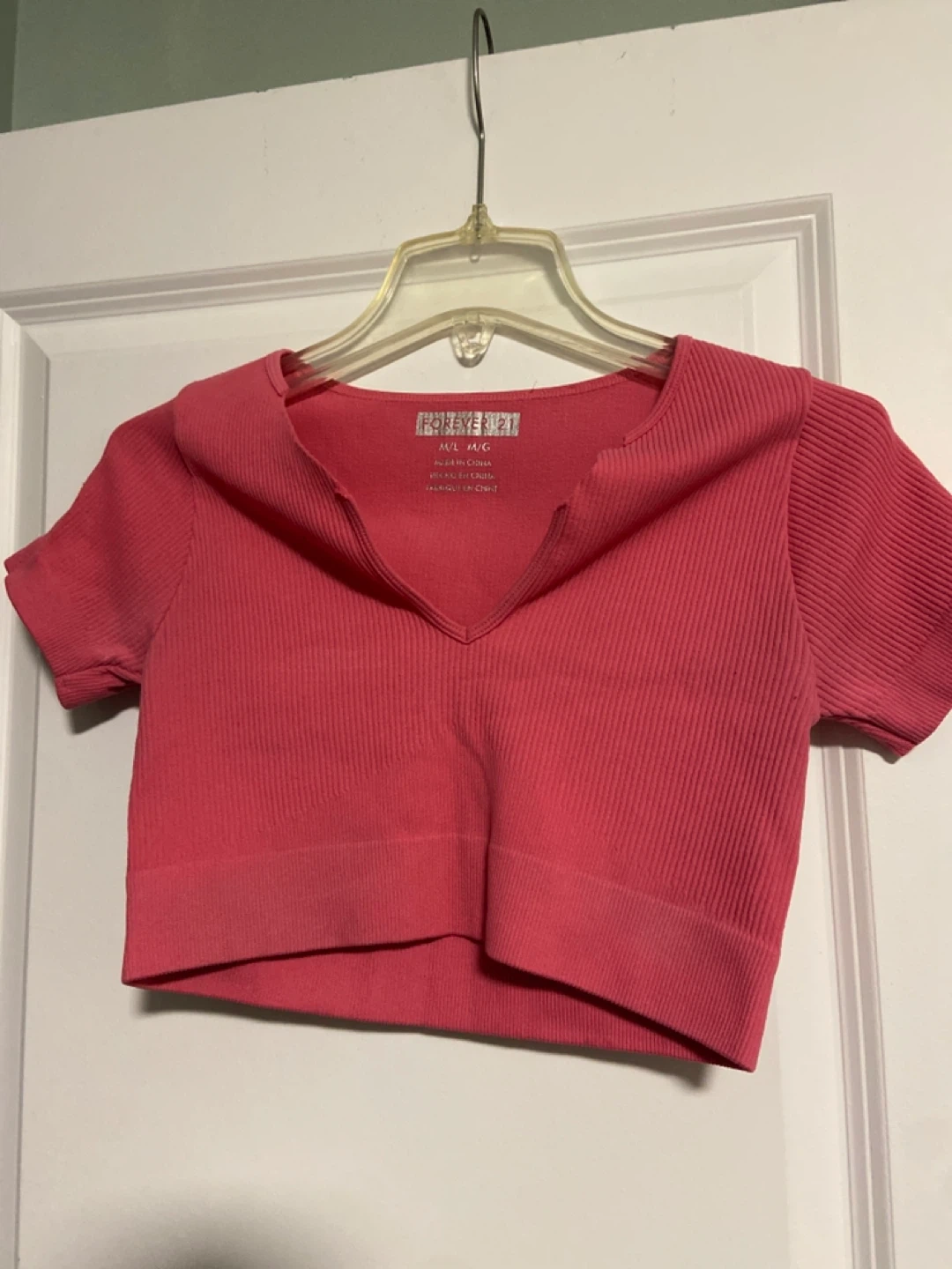 A cute Forever 21 pink crop top in size M/L! It's in great condition and ready for a new home. Perfect for adding a pop of colour to your wardrobe!
