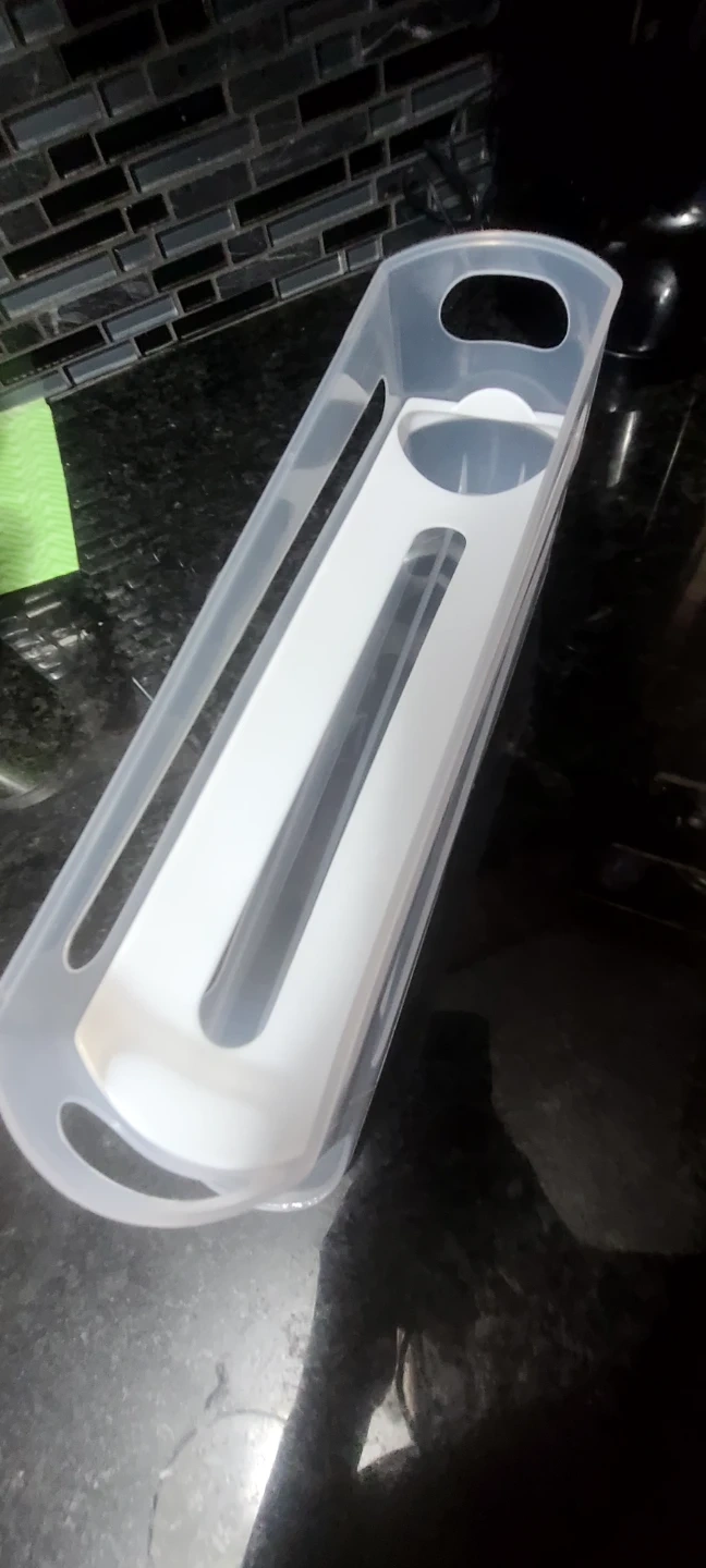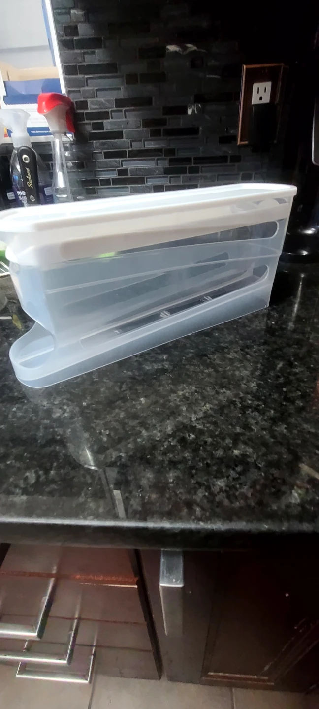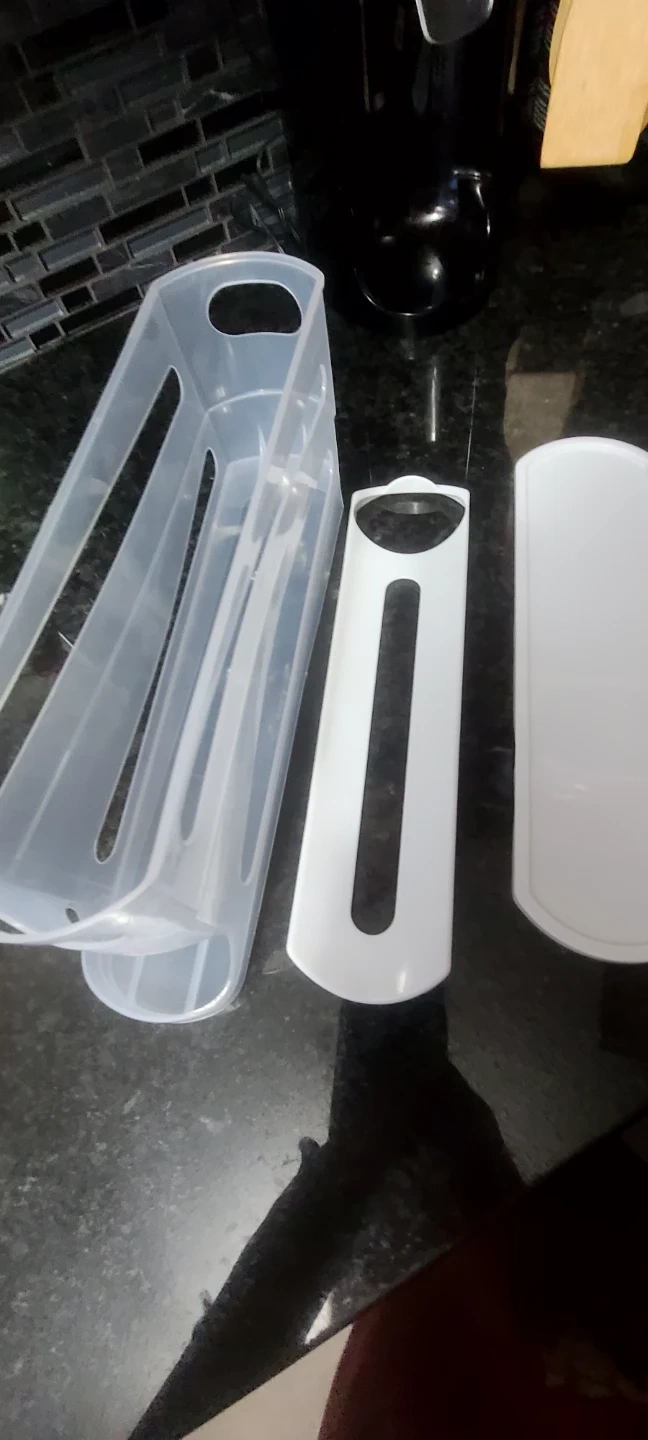 Never used plastic egg holder. Take an egg from the bottom and the next one slides in.