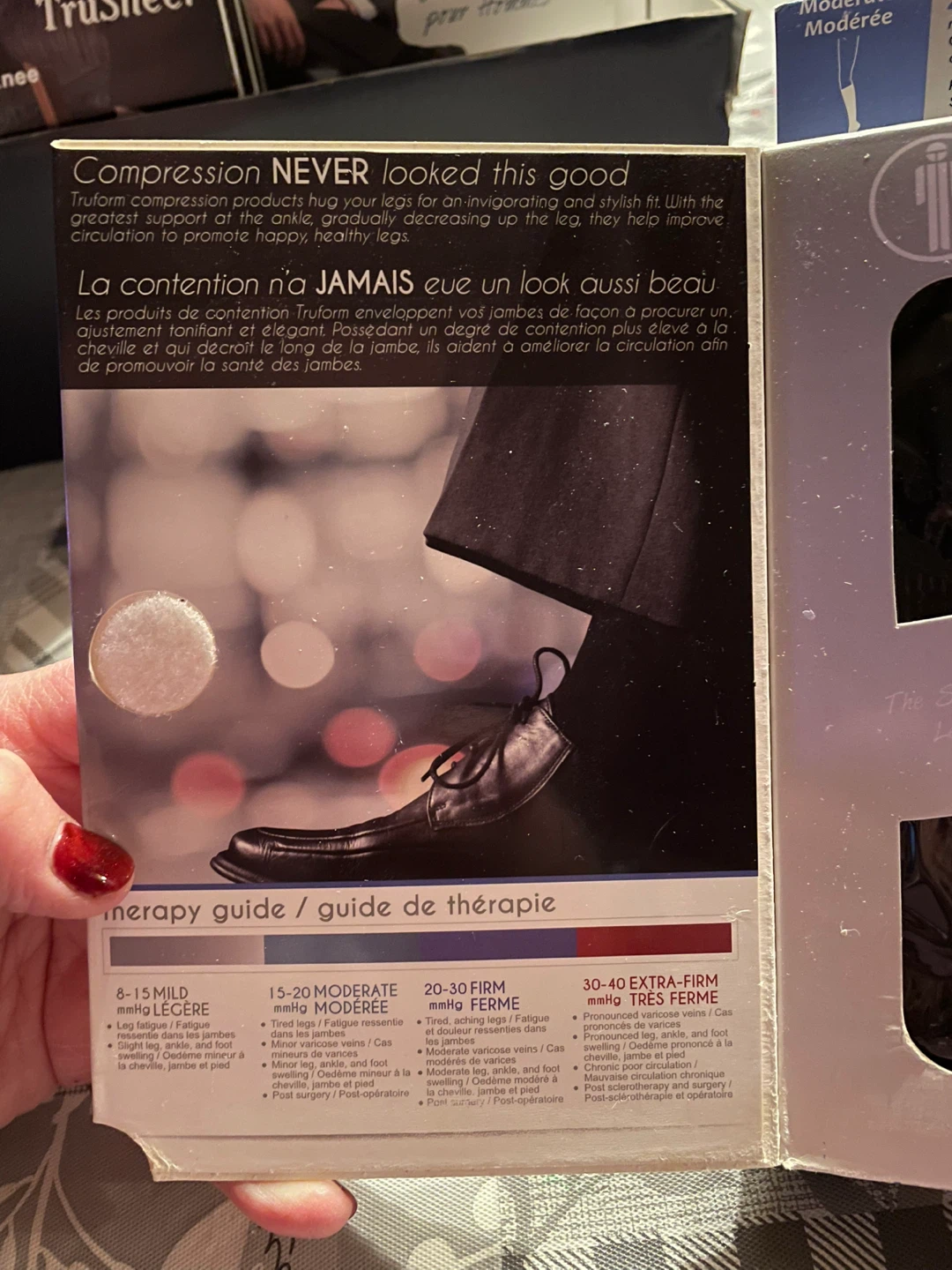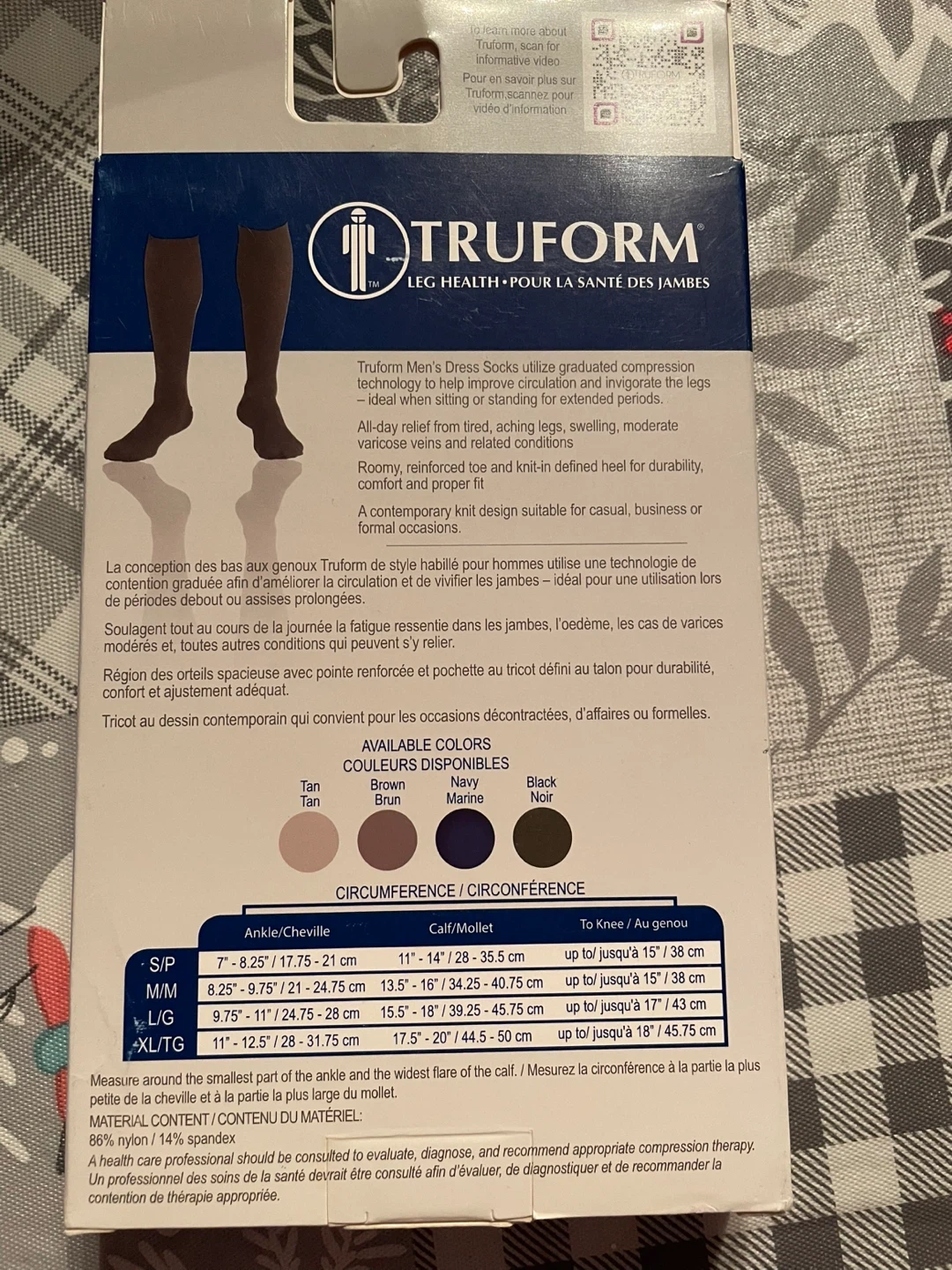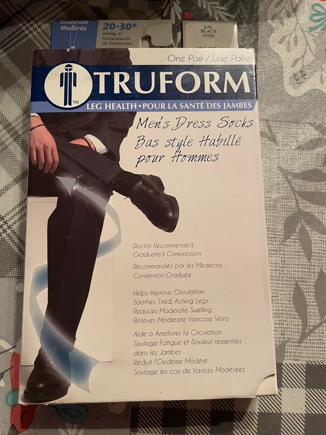 Selling brand new in box pairs of Truform men's dress socks in size large and black. These socks are designed to improve circulation and invigorate the legs, making them ideal for those who sit or stand for extended periods. They help relieve tired, aching legs and reduce moderate varicose veins.