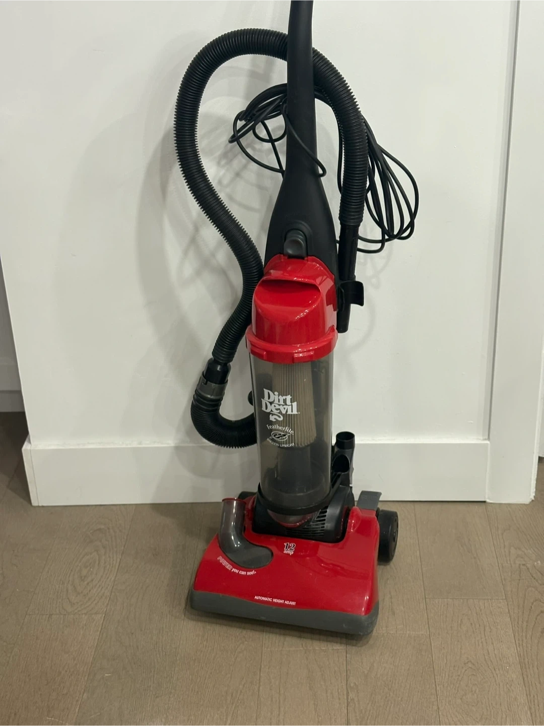 Selling a Dirt Devil Featherlite bagless upright vacuum in red! It's in great shape and ready to help keep your place clean. Features automatic height adjustment for different floor types