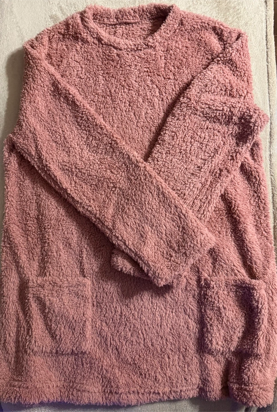 A cozy fuzzy pullover sweater in a lovely rose/mauve colour! It features a round neck and two front pockets, perfect for keeping your hands warm on chilly days. This sweater is in great condition and ready for a new home