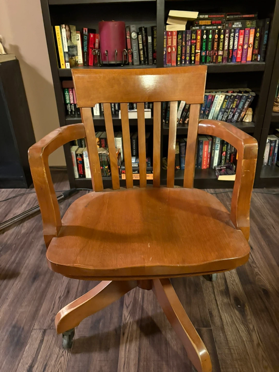 Here's a wooden swivel desk chair! It has a classic look and would be great for a home office or study space. It shows some signs of wear but is still sturdy and functional