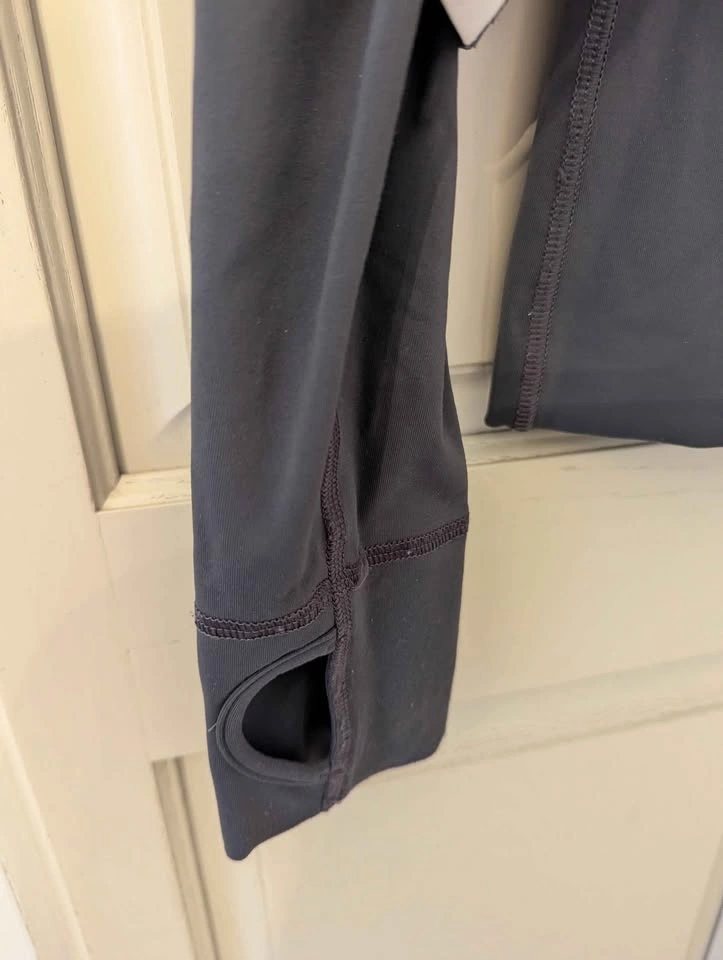 Beautiful and unique Lululemon jacket in a chic gray and white colorway. Features a breathable mesh back opening with a separate top cover in a subtle checked pattern for both style and function. The distinctive arm detailing sets this piece apart, making it truly one-of-a-kind.