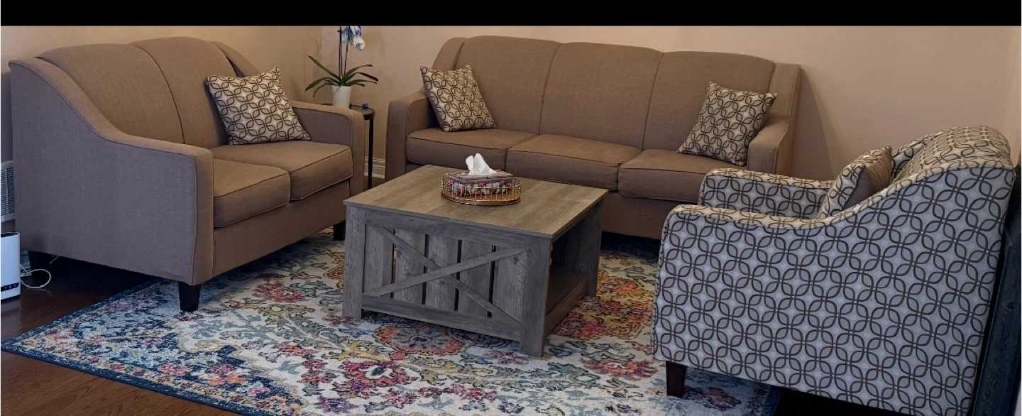 Selling a gently used sofa and armchair set, perfect for a living room or den. The set includes a three-seater sofa and two armchairs. The neutral colour would fit in with any decor. Great condition!