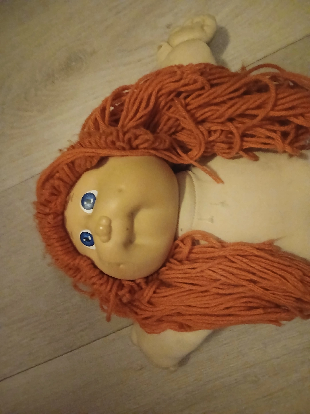 Selling a vintage Cabbage Patch Kids doll! This doll has red hair and blue eyes. It appears to be from 1984, as indicated by the signature on the doll.