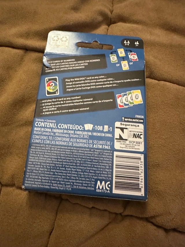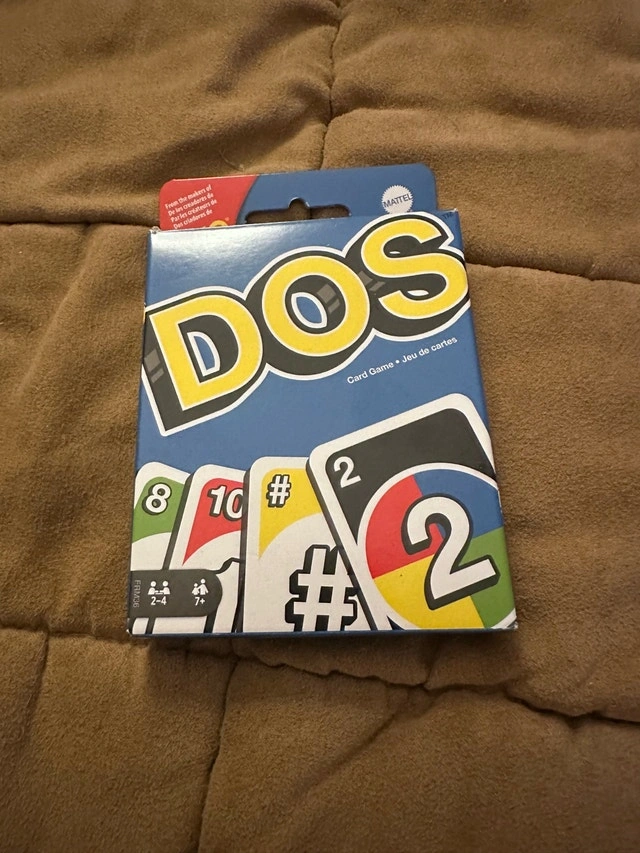 I'm selling a Mattel DOS card game, a fun and engaging game for 2-4 players, where you match numbers and colours to get rid of your cards, similar to Uno. This game is in excellent condition and has been gently used. Here are some details about the game: