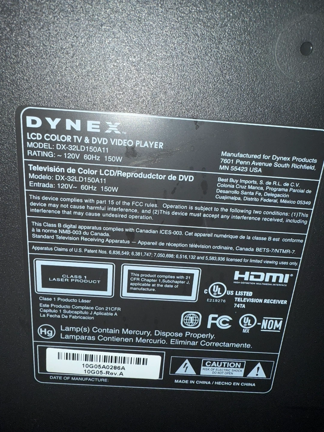 The DX-32LD150A11 is a 32-inch LCD HDTV/DVD Combo with 720p resolution manufactured by Dynex, a Best Buy exclusive brand. It functions as both a television and a monitor via its multiple input options.