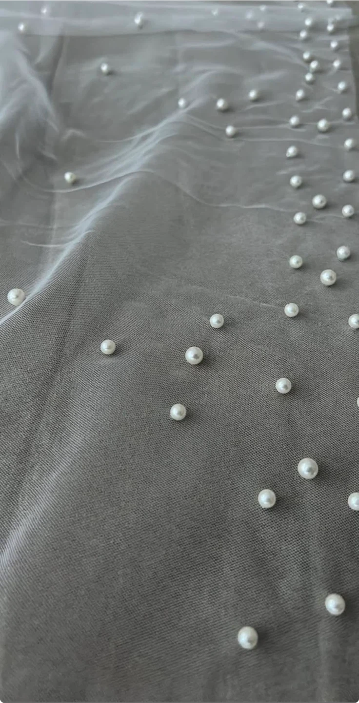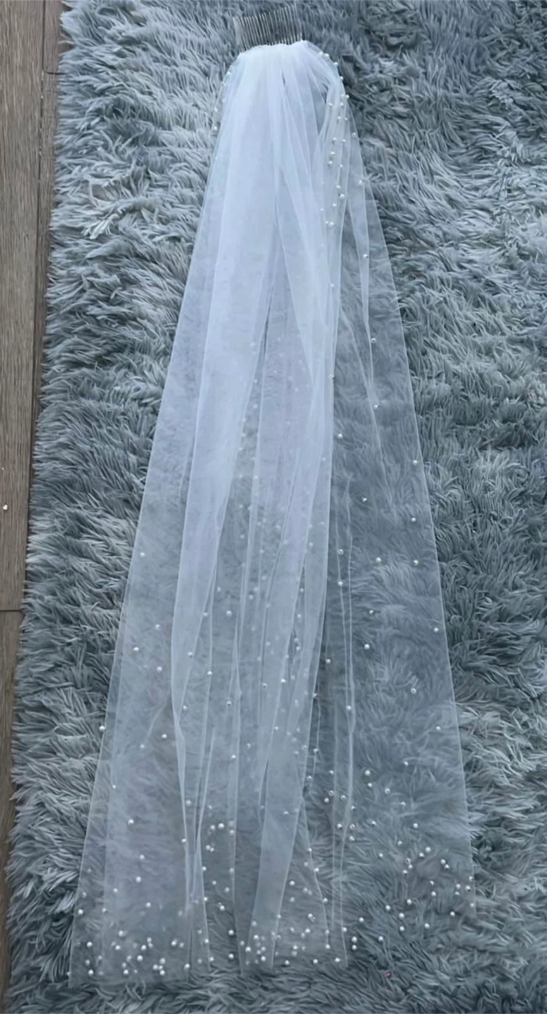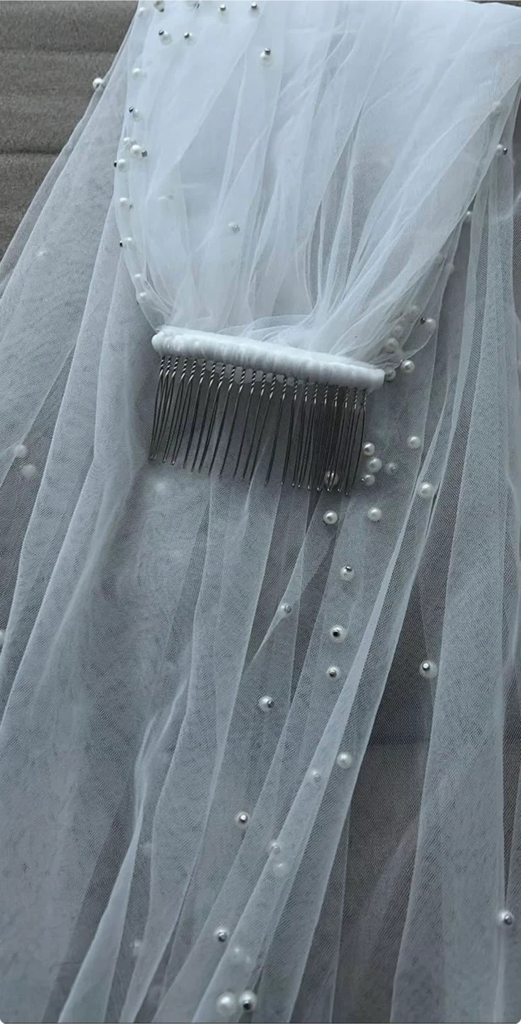 Selling a beautiful white wedding veil adorned with delicate pearls. It's in great condition and perfect for adding a touch of elegance to your special day! The veil includes a comb for easy attachment.