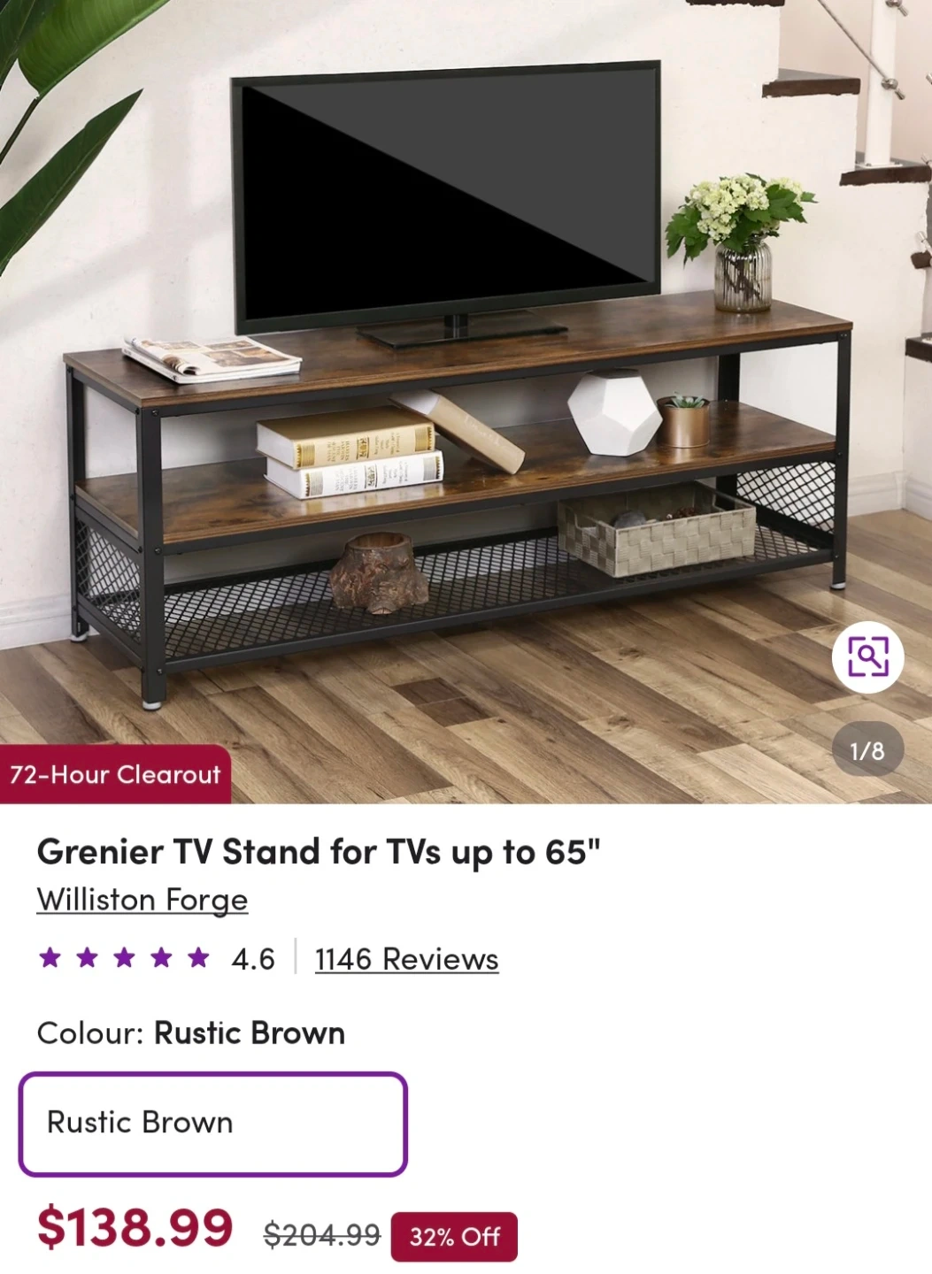Looking to sell this lovely TV stand from Williston Forge! It's in great shape and would be perfect for a TV up to 65 inches. The colour is rustic brown.