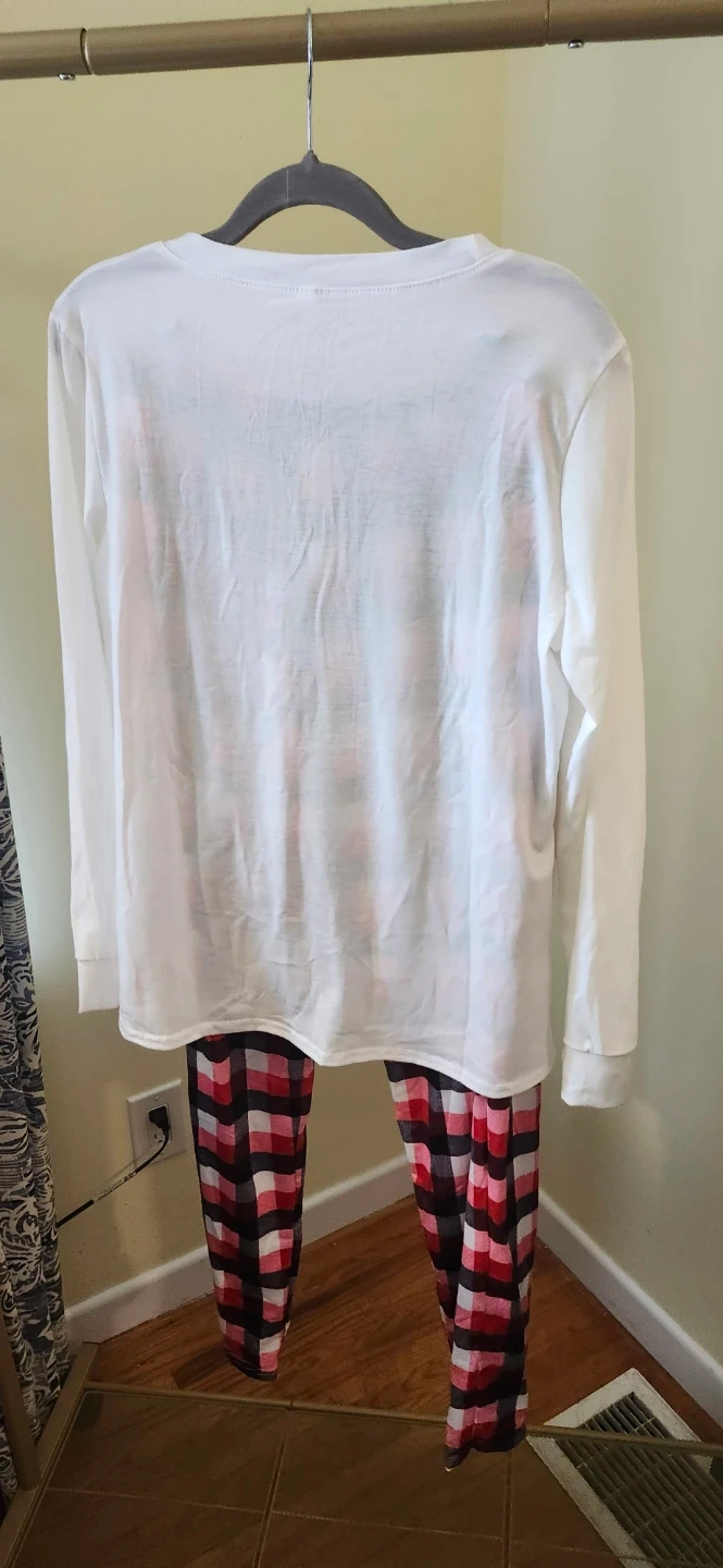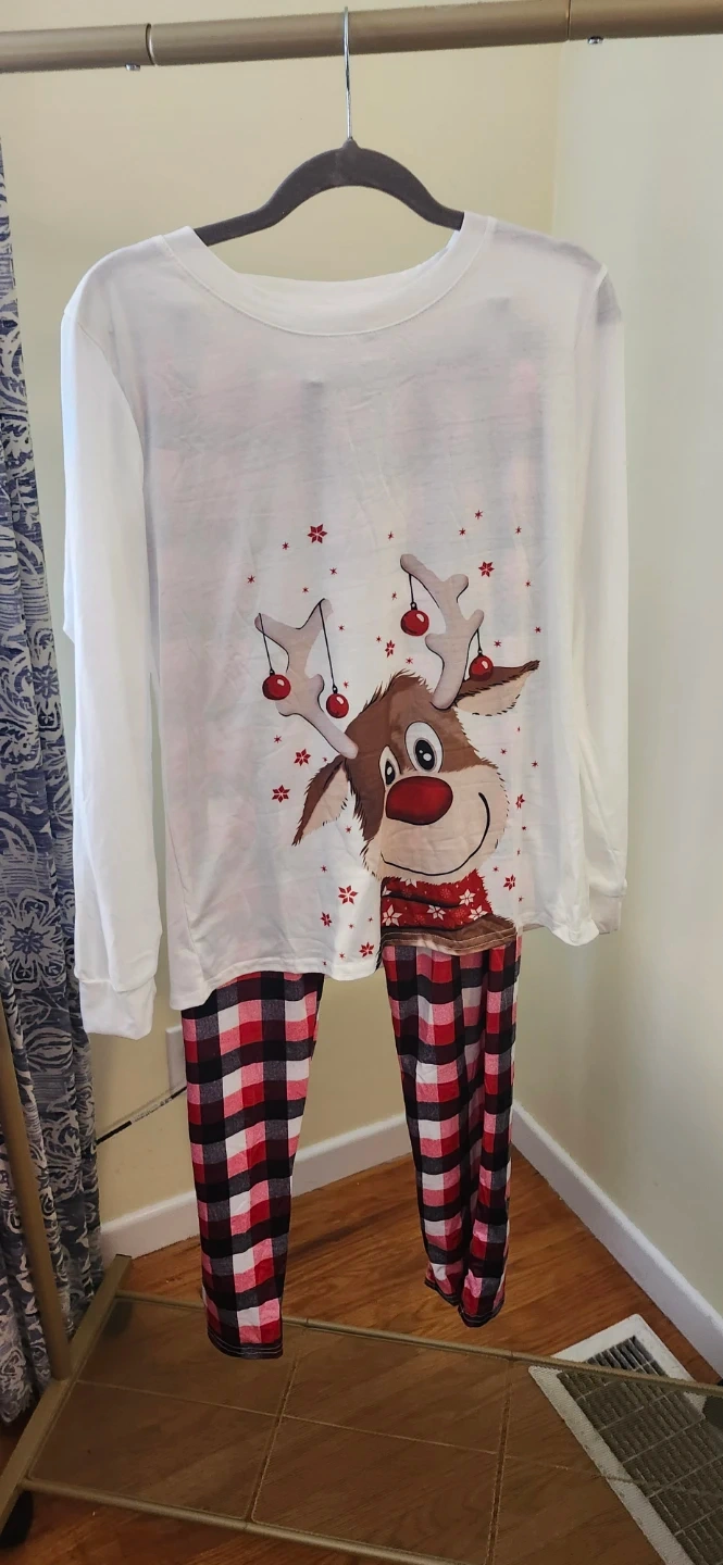 81Cozy Christmas pajama set with a cute reindeer design! Perfect for the holidays, this set includes a long-sleeve white top with a reindeer graphic and plaid pants. Get ready for some festive fun!