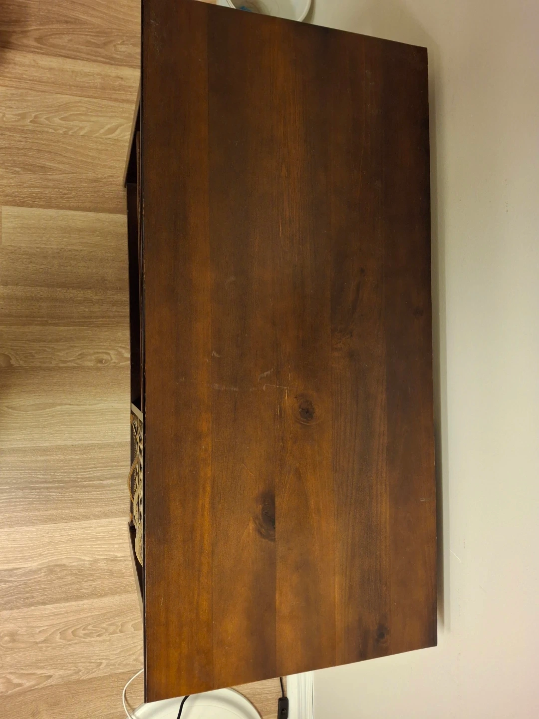 MOVING SALE Dark Wood Console Table with Wicker Baskets