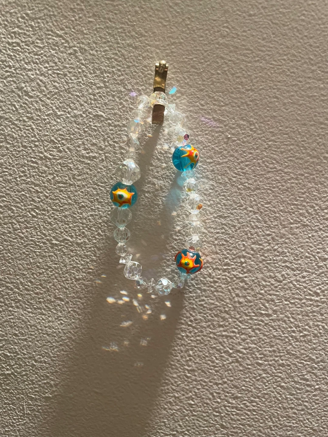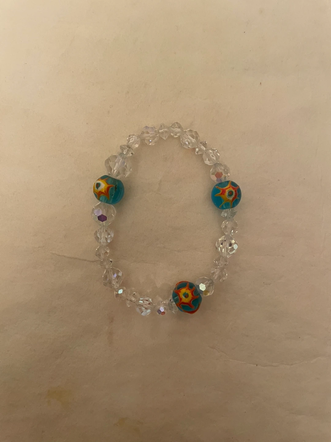 This is a crystal bead bracelet. It features clear crystal beads and three colourful accent beads. It's in great condition and would make a lovely addition to any outfit