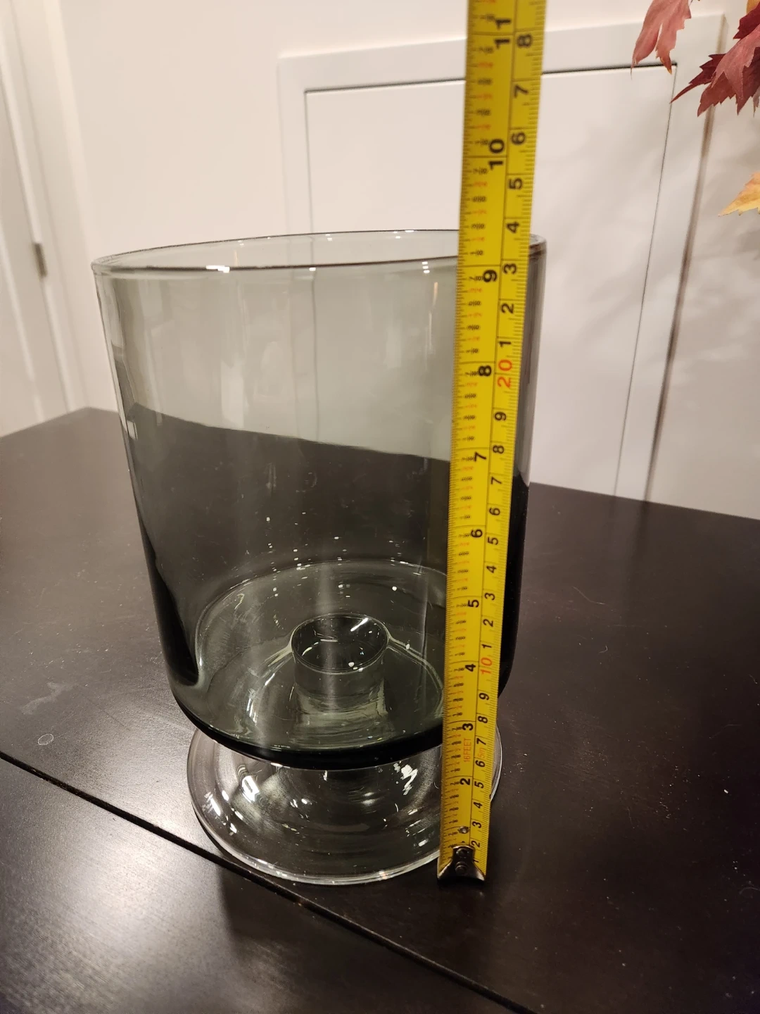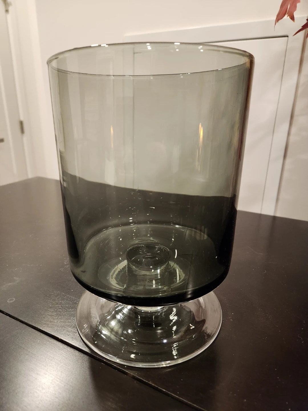 Selling a smoked grey glass vase in great condition! It measures approximately 11 inches in height. Perfect for displaying flowers or as a decorative piece with a candle. Cash only