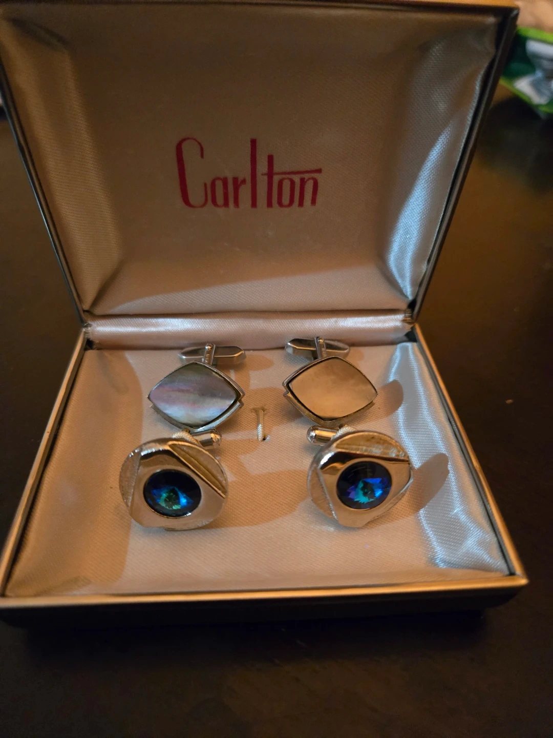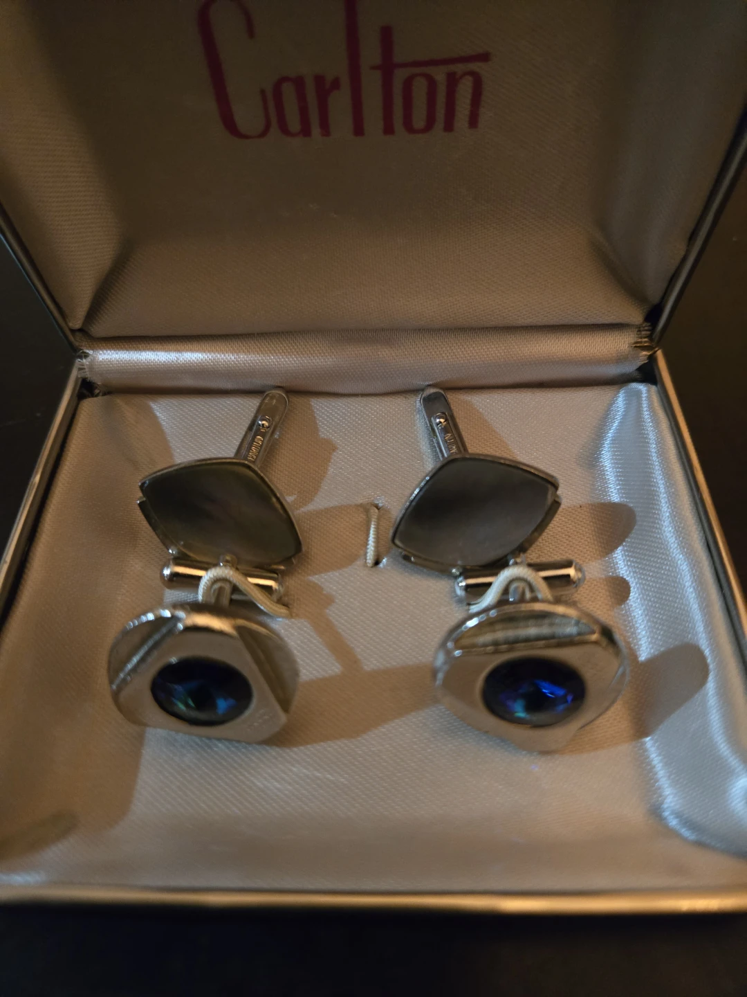Selling two sets of cufflinks, complete with their original box! They feature a unique design with a blue stone and a mother-of-pearl style inlay.