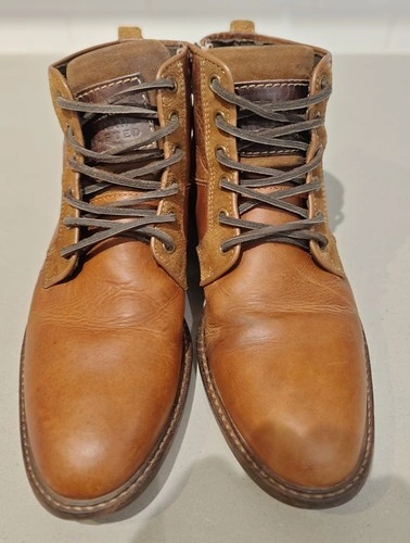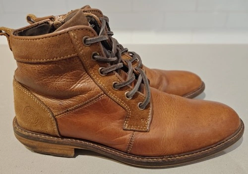 Authentic Bullboxer “Redmond” men’s leather boots, handcrafted in Portugal, featuring high-quality European craftsmanship and classic design. Finished in a rich tan/cognac leather, these boots have been well cared for and recently treated with mink oil and wax to restore shine and protect the leather. Condition: Very good overall condition with medium heel wear from normal use. New laces installed for a clean, refreshed appearance. Leather is soft, conditioned, and ready to wear. Stored in a smoke-free home. Details: Model: Redmond (Art Name) Size: US 8 / EU 41 Upper: Genuine leather Balance: Man-made materials Made in: Portugal Serial No.: 1323T – Handcrafted Series Color: Tan / Cognac brown Lining: Soft textile interior Outsole: Durable stitched rubber sole Highlights: Handcrafted European quality Premium leather upper with natural patina Comfortable and stylish for everyday wear Recently conditioned and ready for its next owner