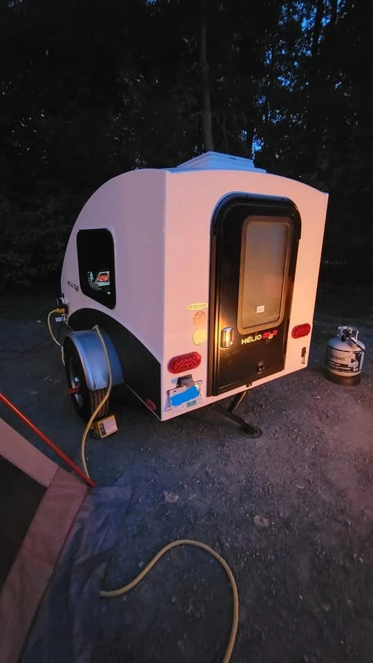 Made-In-Canada! This trailer is low maintenance (No Winterization needed), lightweight, and extremely sturdy. It's easy to move around a campground and small enough to park inside a normal garage, unlike most other teardrops. It's also light enough to be towed by pretty much any type of car. It was even advertised as being towable by a motorcycle.