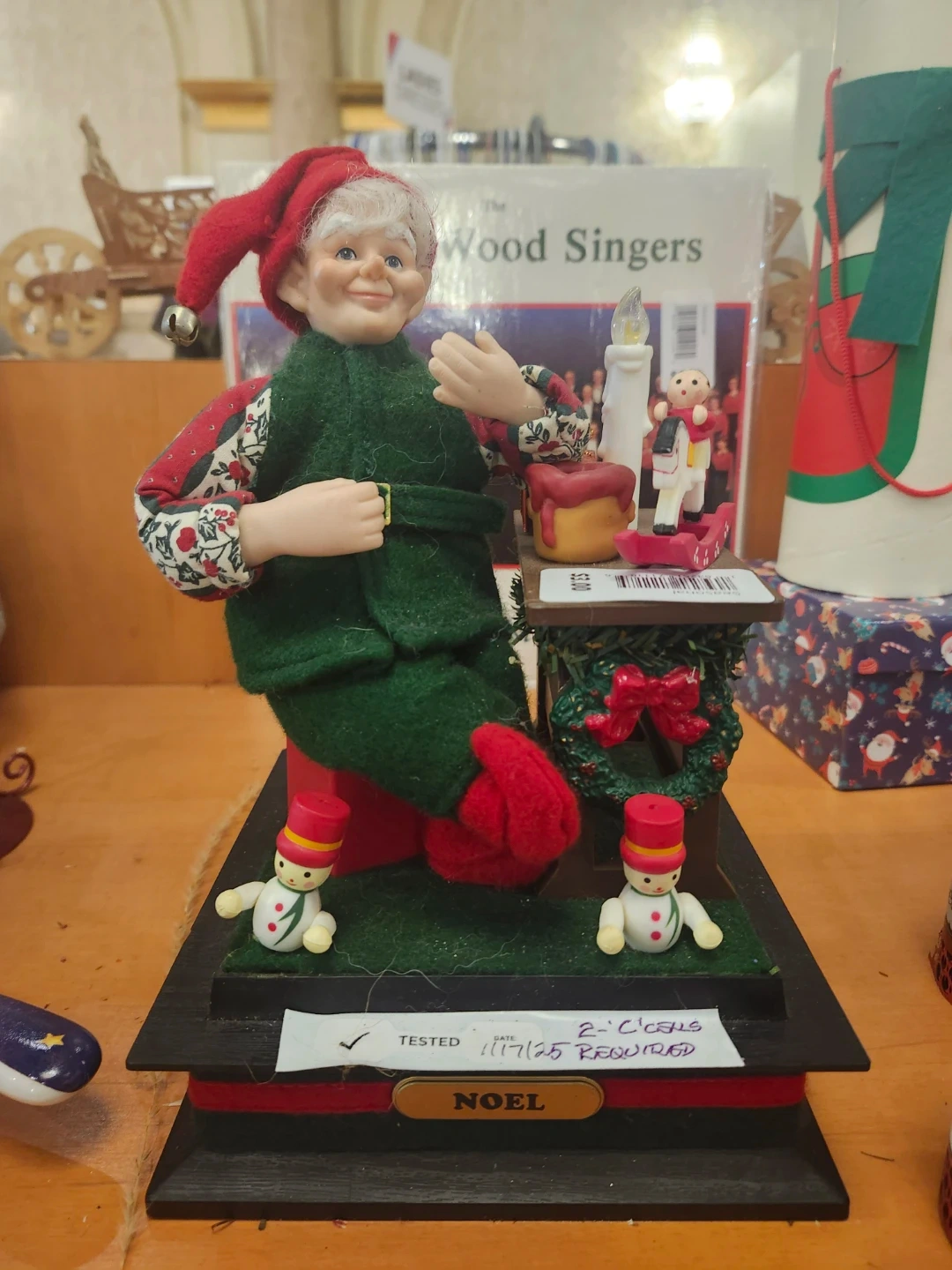 This is a charming elf figurine from The Wood Singers, named Noel. It features an elf with a red hat and green vest, surrounded by festive decorations like a wreath, miniature soldiers, and a candle. It requires 2 C cell batteries.