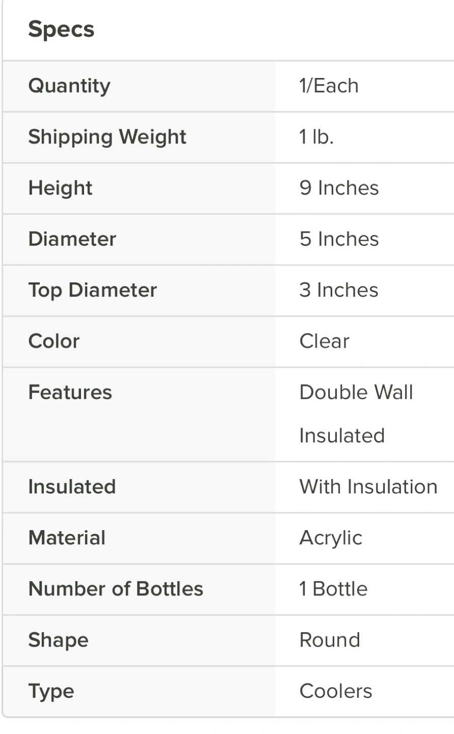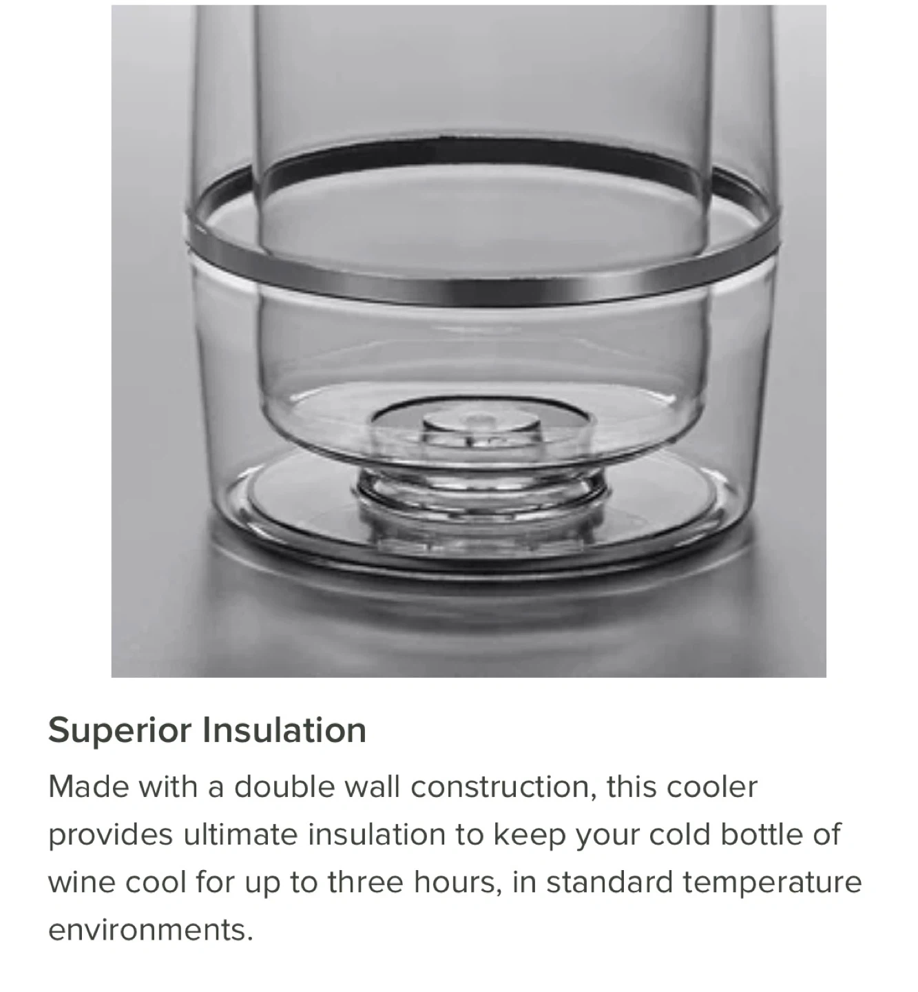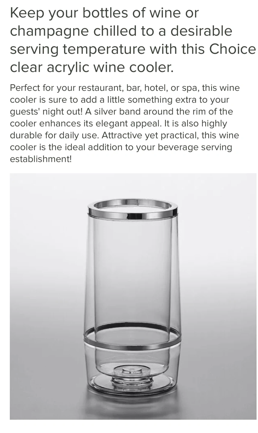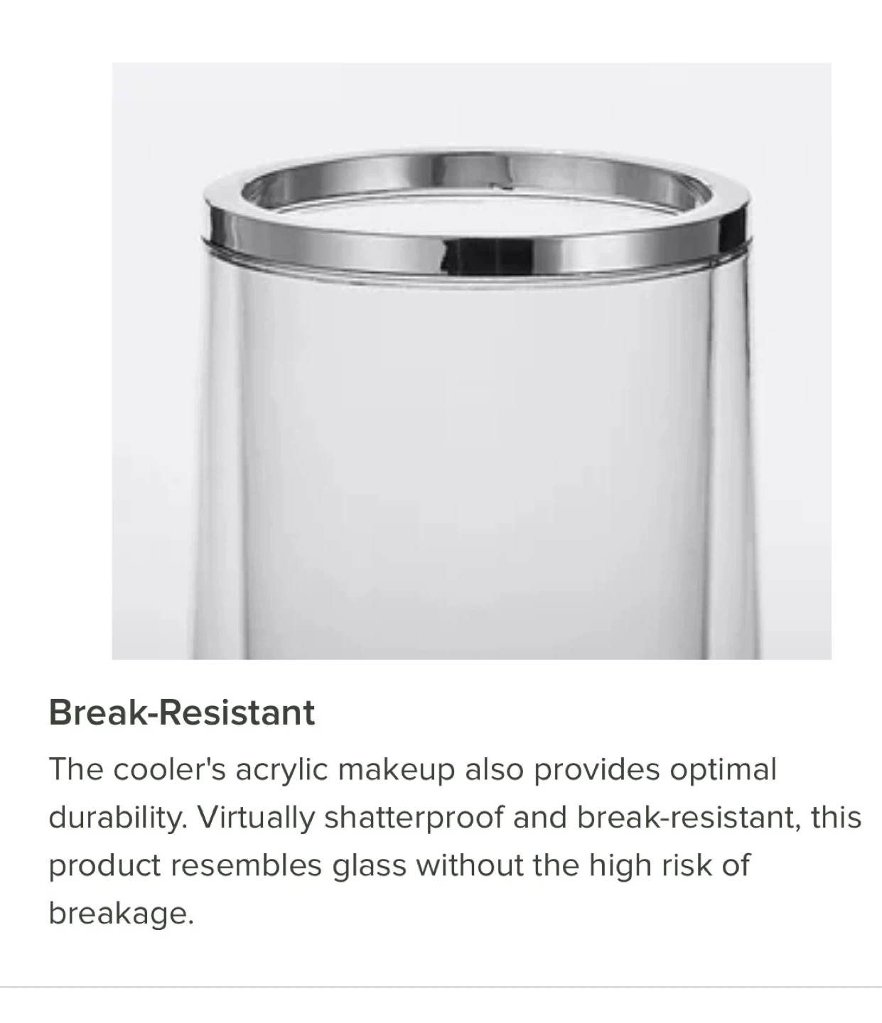 Keep your wine or champagne chilled with this clear acrylic wine cooler! Its double wall construction provides ultimate insulation to keep your cold bottle cool for up to three hours. The clear construction allows guests to see their bottle of wine and lets servers see when supply is running low. It's also break-resistant!