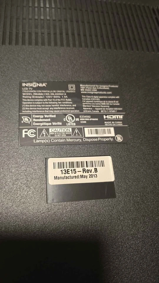 Insignia 39” LCD TV with Wall Mount – Heavy, Works Great