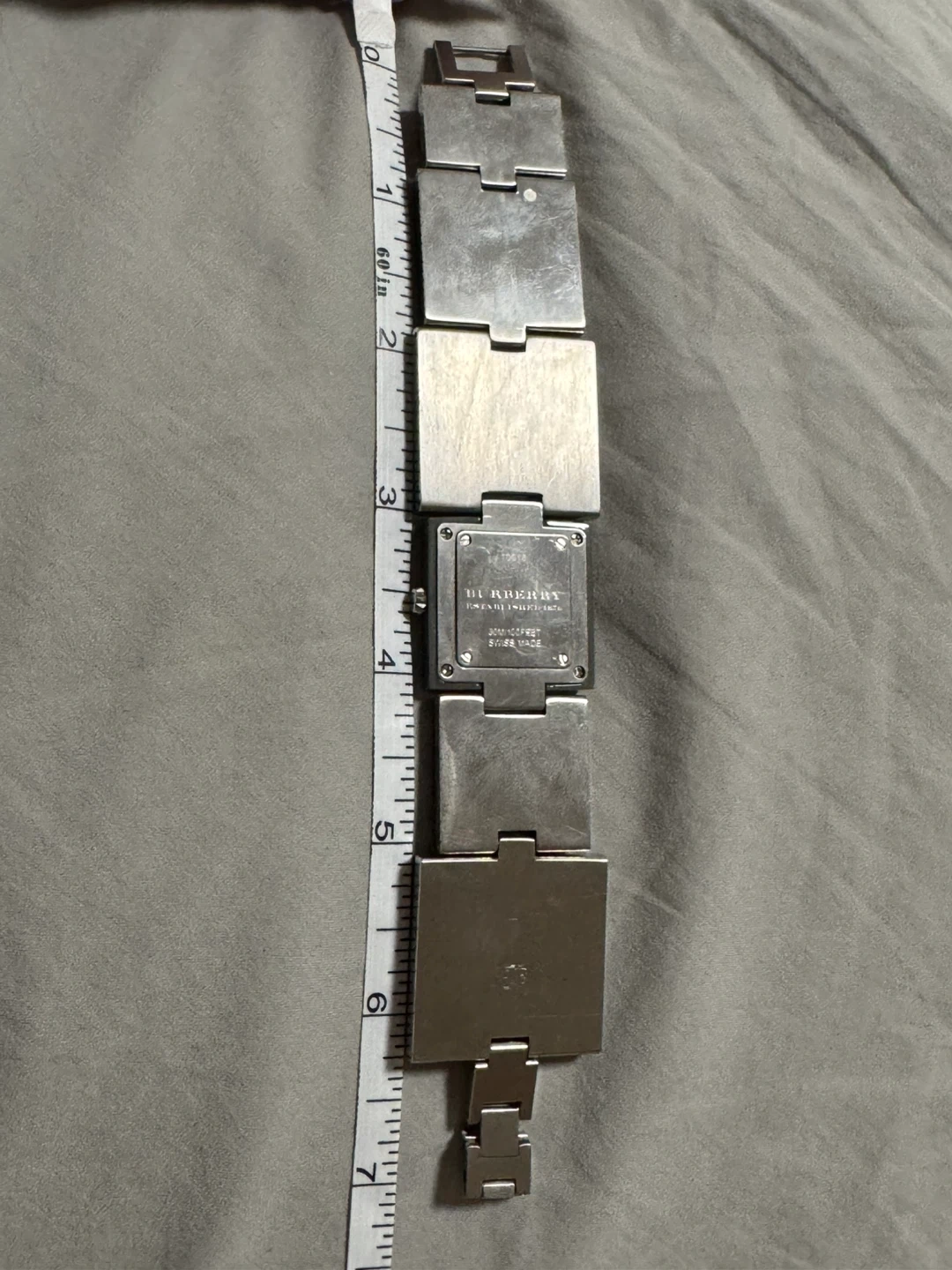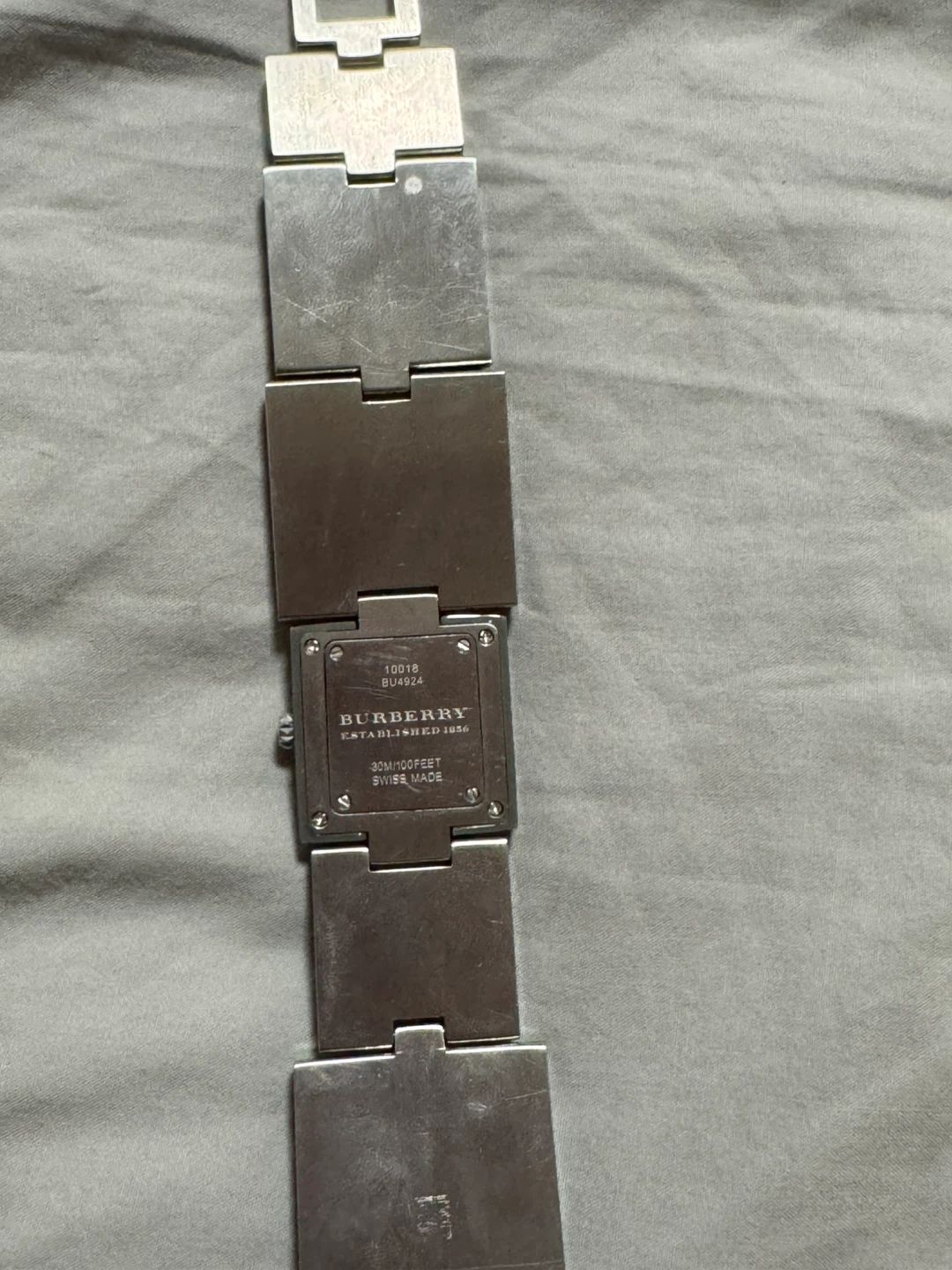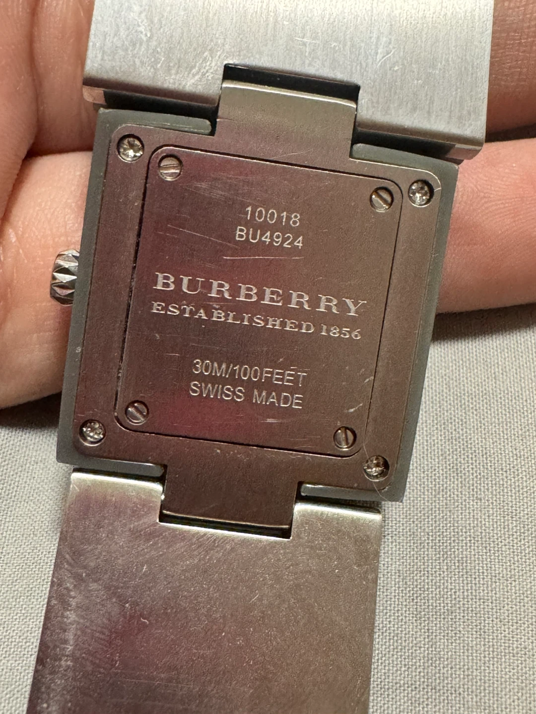 Selling a Burberry ladies' watch. The model number is BU4924. It's Swiss made and water resistant to 30m/100 feet. It has a unique square design.