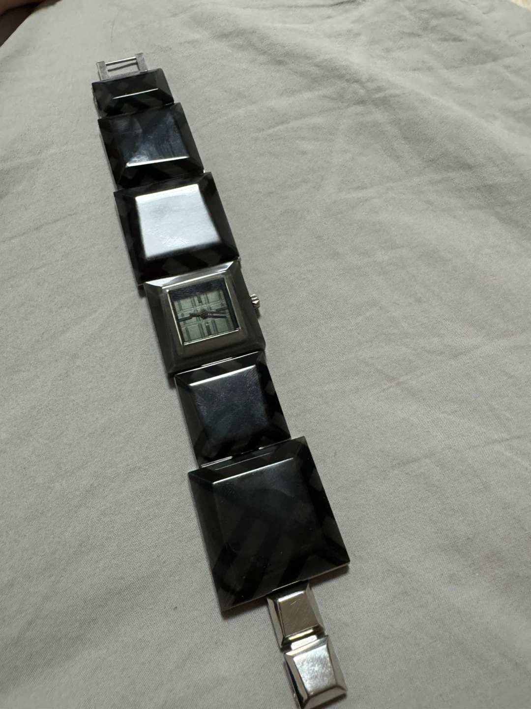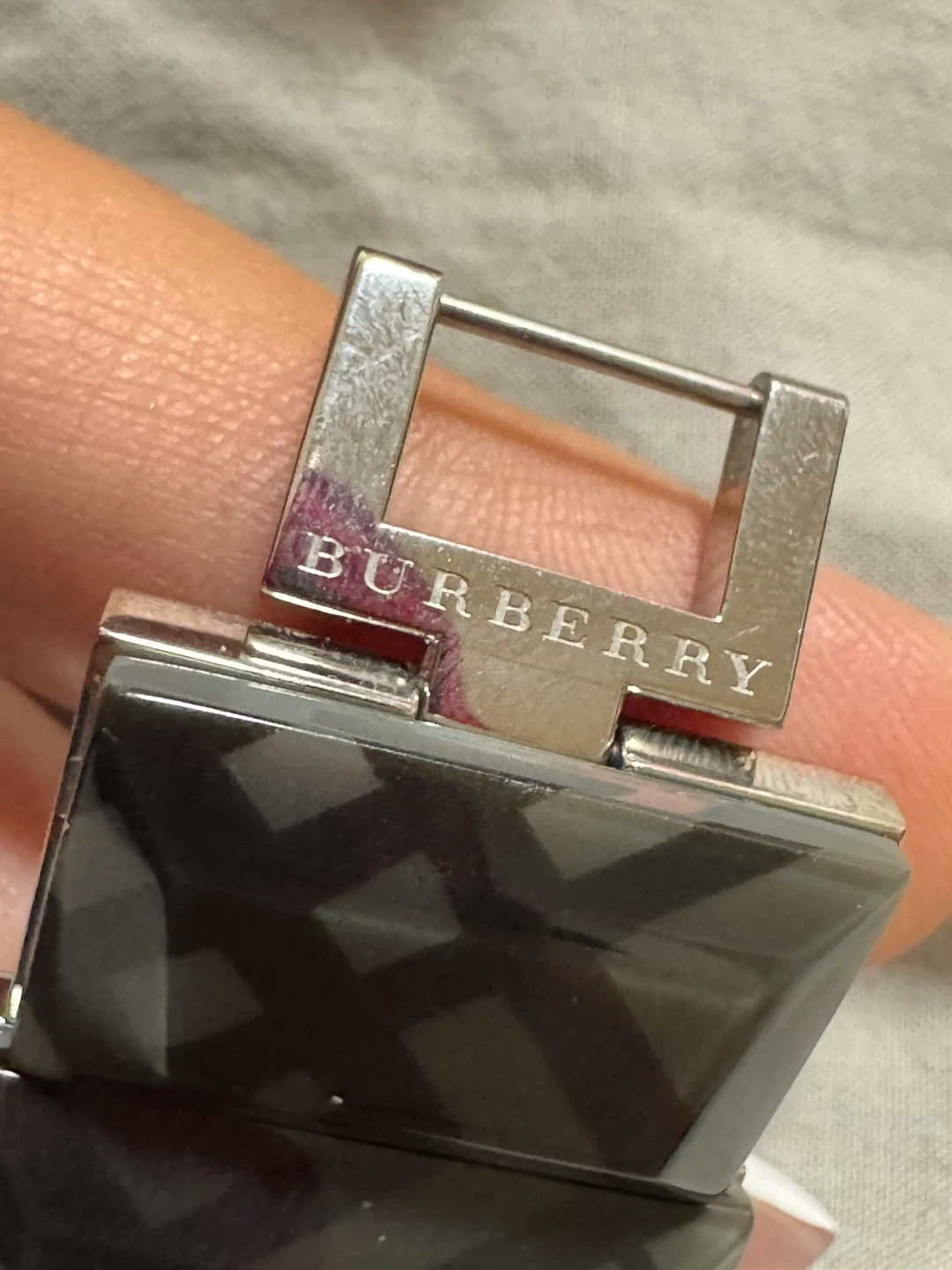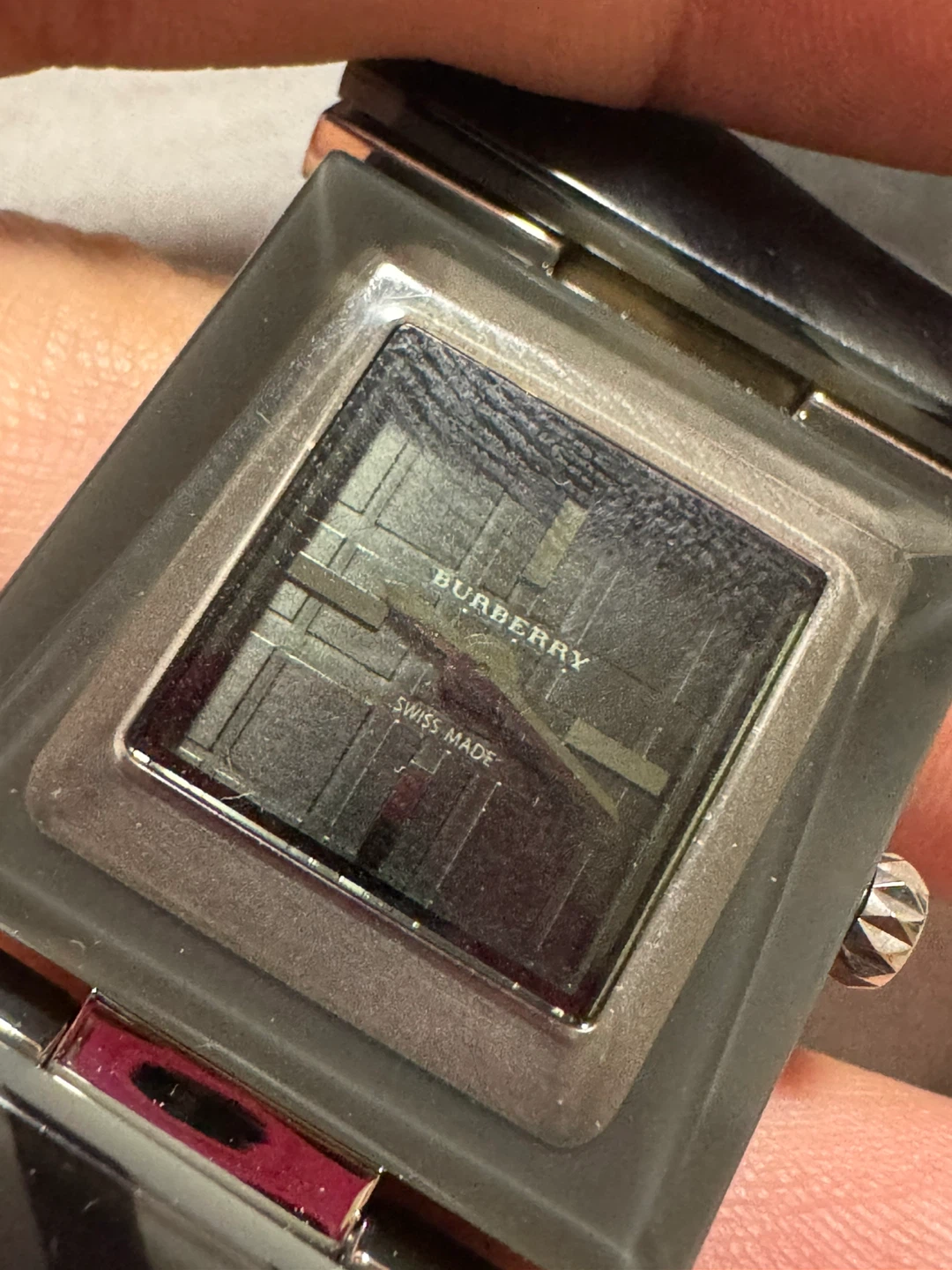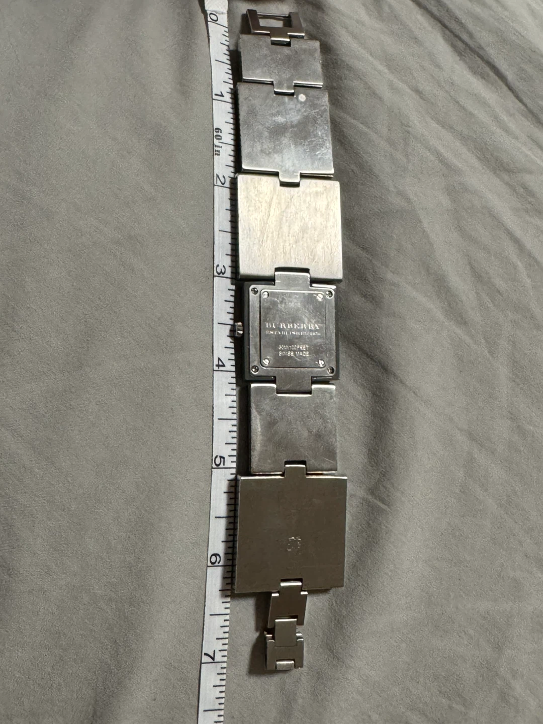Selling a Burberry ladies' watch. The model number is BU4924. It's Swiss made and water resistant to 30m/100 feet. It has a unique square design.