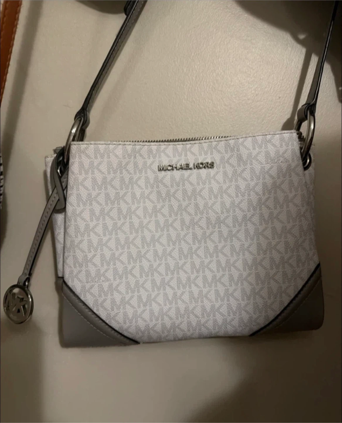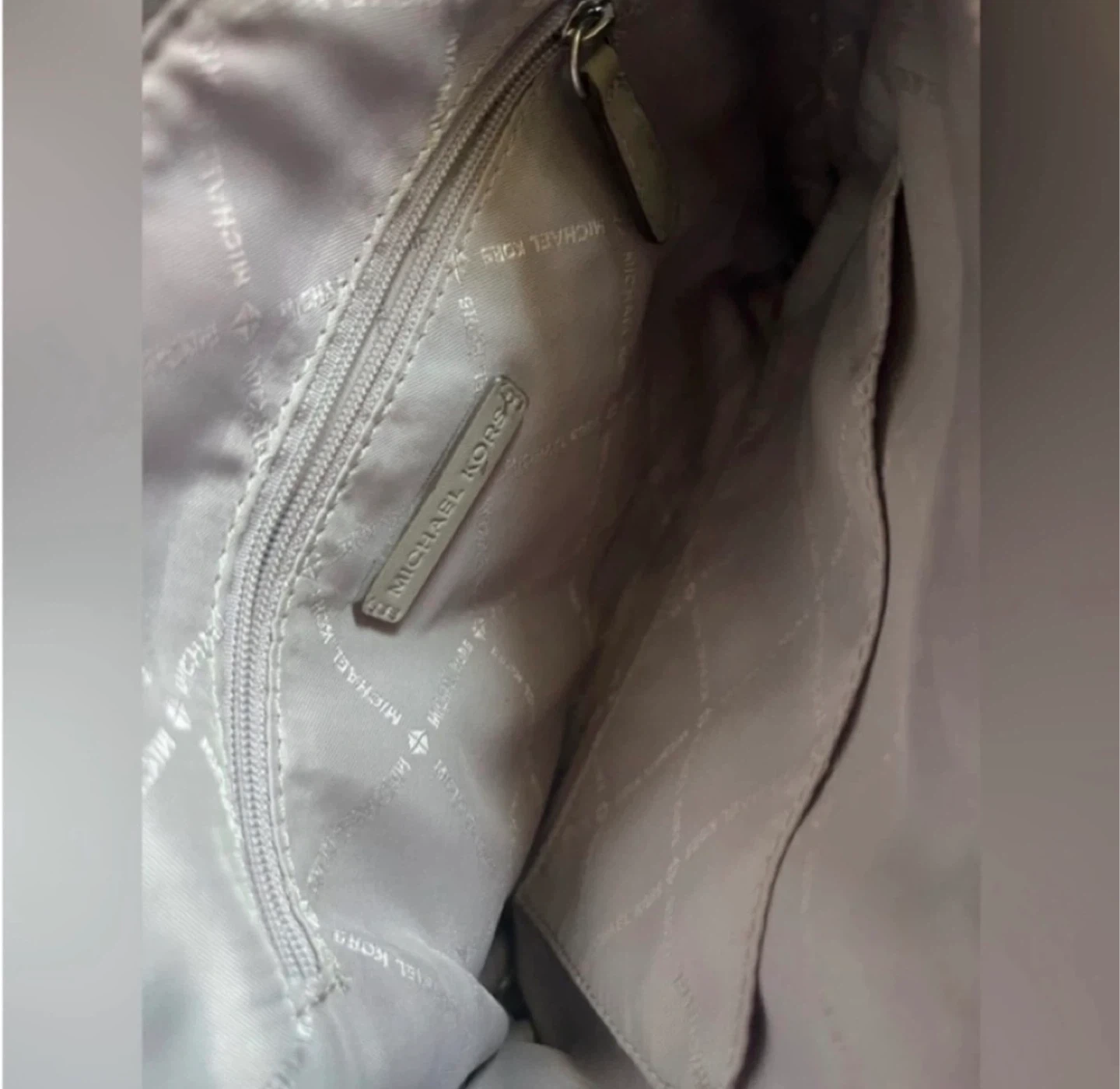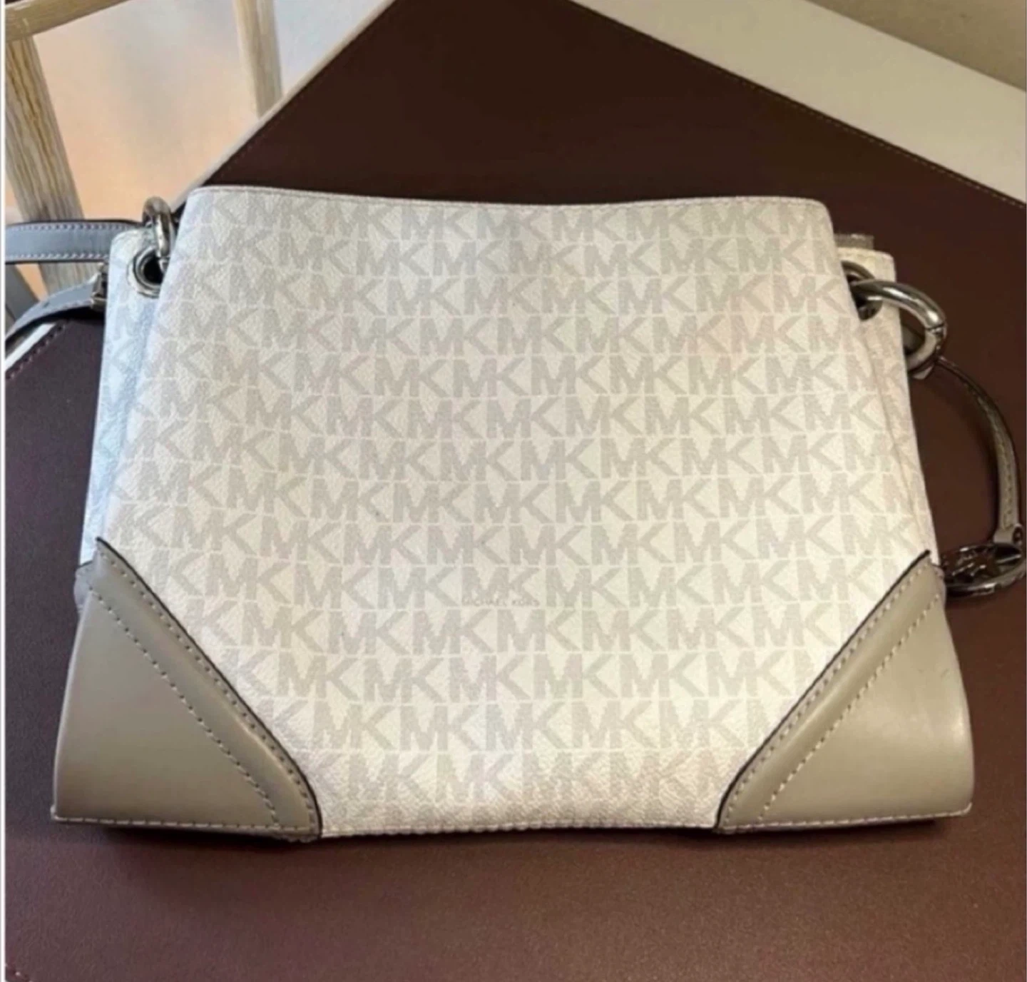 This Michael Kors bag is in great condition and ready for a new home! It features the classic MK logo pattern and a stylish grey trim. The interior has multiple pockets for organization
