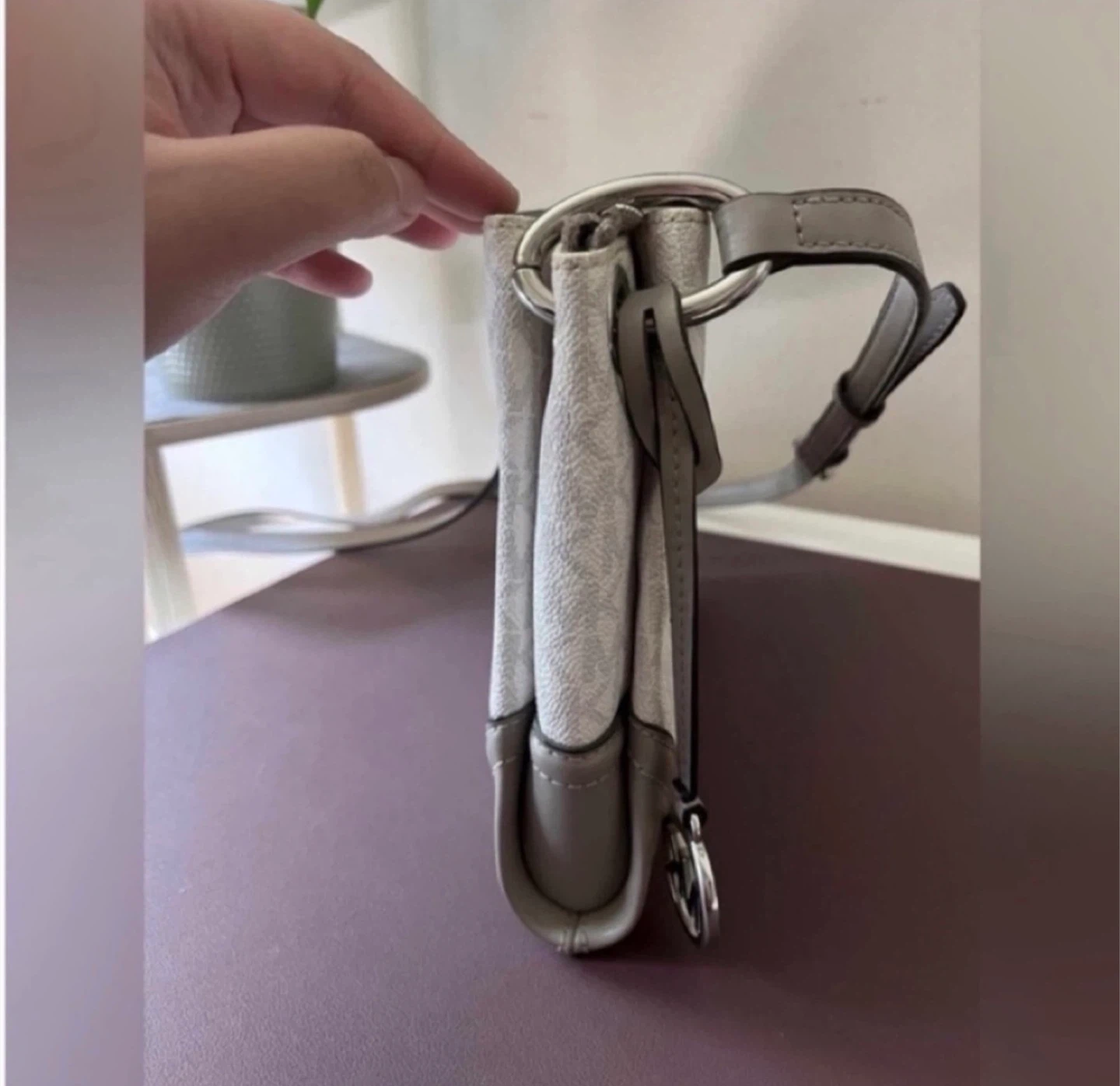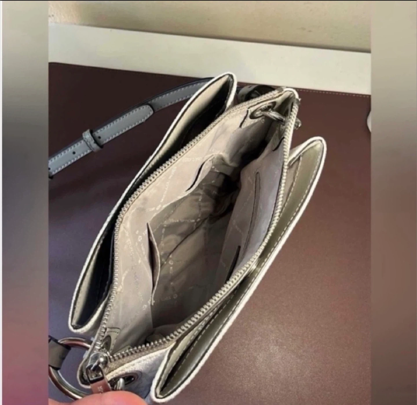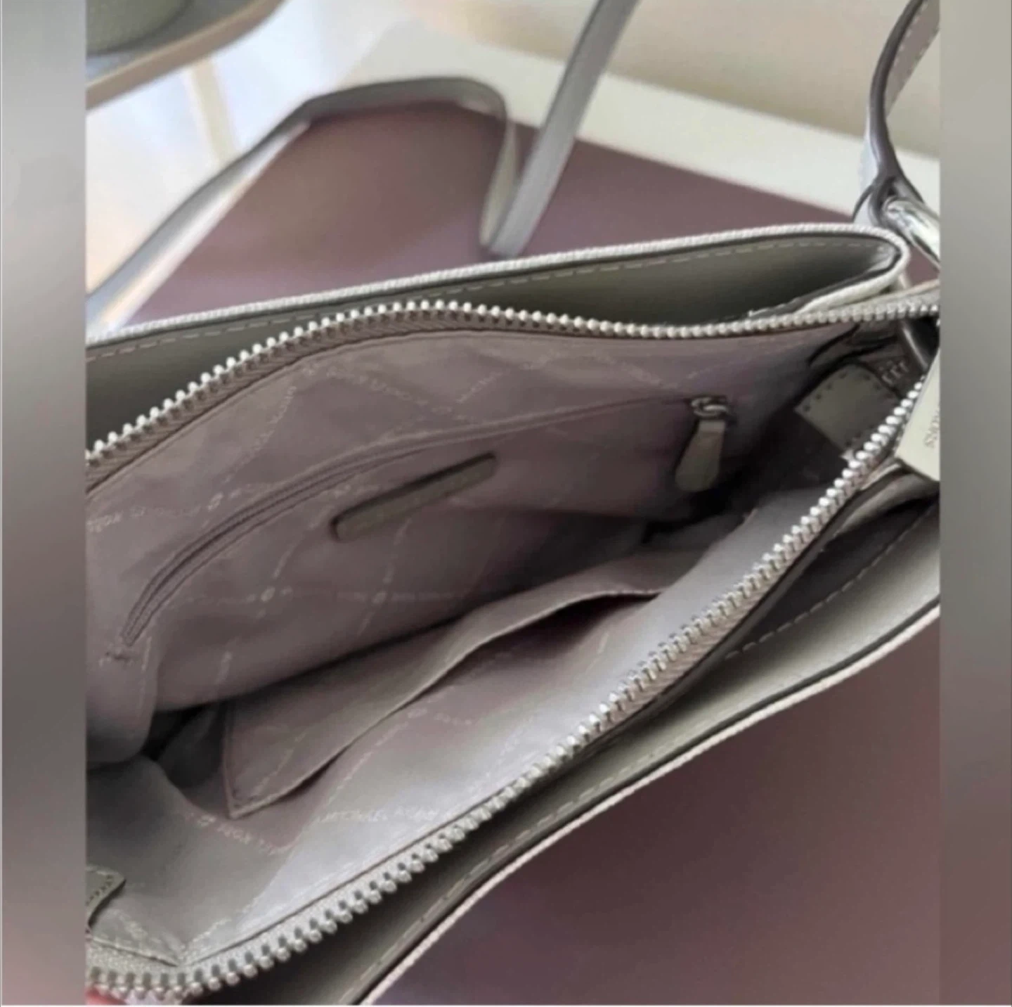 This Michael Kors bag is in great condition and ready for a new home! It features the classic MK logo pattern and a stylish grey trim. The interior has multiple pockets for organization
