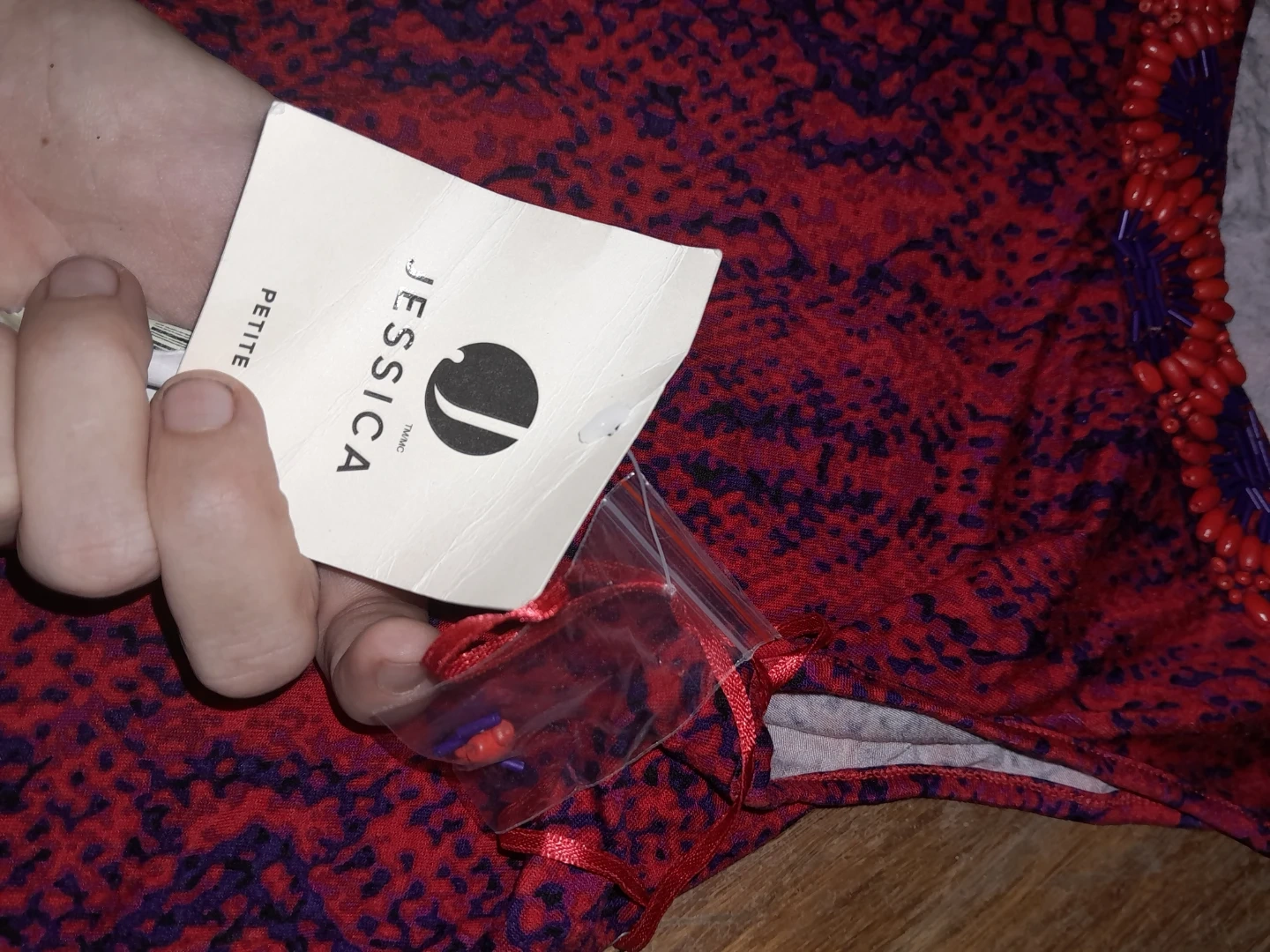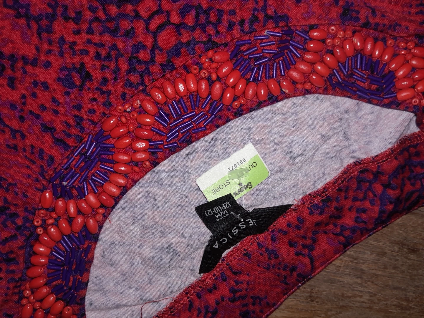 194This is a Jessica brand, petite size M/M top in red and purple. It has a unique snake-like pattern and beaded detailing around the neckline. It's in great condition and ready for a new home!