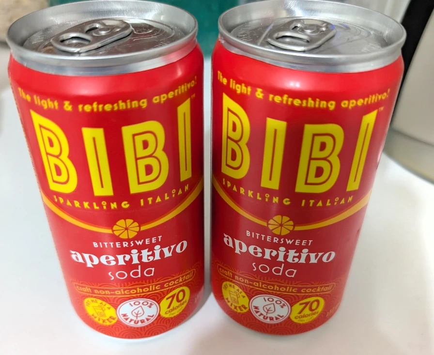 two cans of BIBI Aperitivo Soda, a sparkling Italian bittersweet soda. It's a light and refreshing non-alcoholic cocktail. Each can contains 70 calories and is made with natural ingredients.