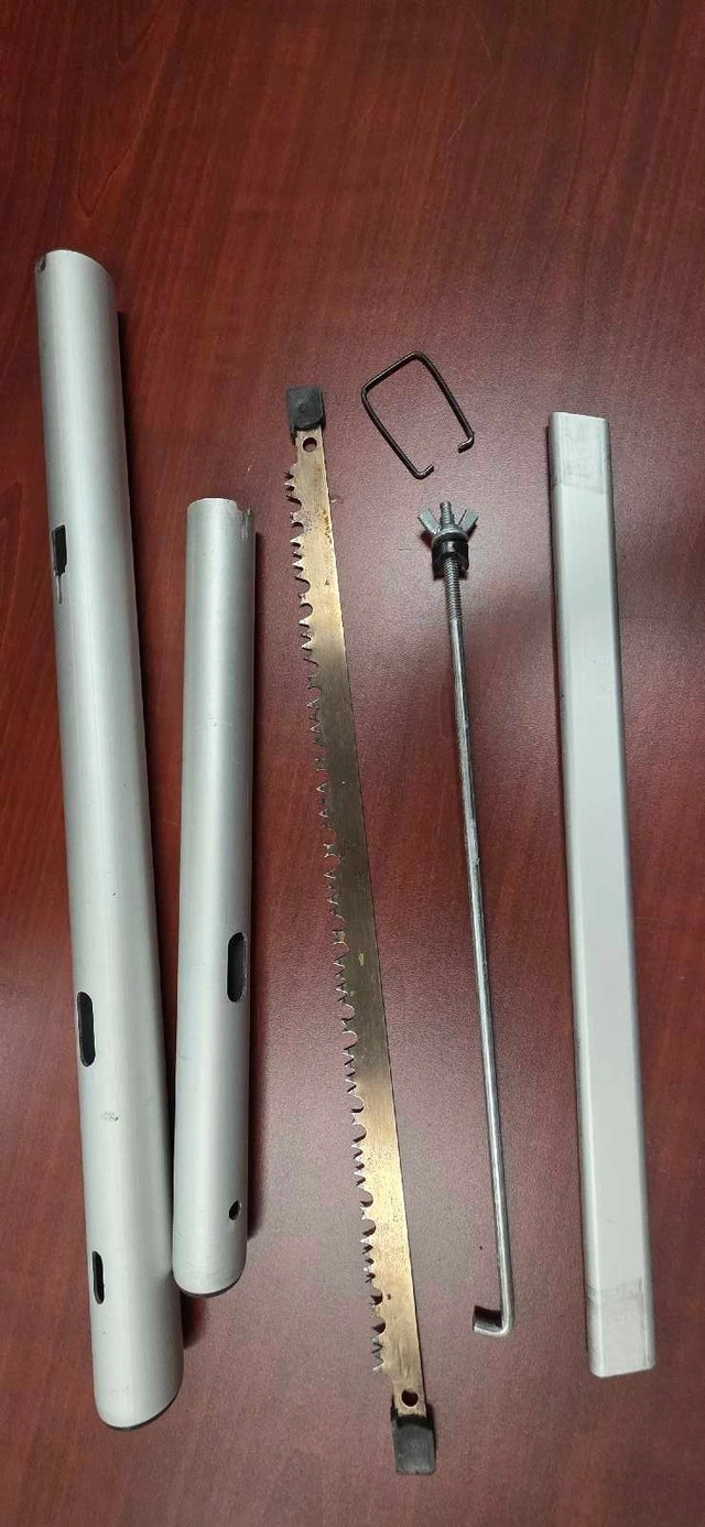 Made in Canada. This is an 18 Inch Trail Blazer Take Down Buck Saw, perfect for outdoor adventures, camping, and trail maintenance, in excellent used condition. It's designed for easy portability and quick assembly, making it a reliable tool for cutting branches and small logs. The saw disassembles and stores inside of the handle. Please see pictures for details on the condition. The saw blade appears to have little use. This has a retail value of about $50, so I'm asking $10 for a quick sale!
