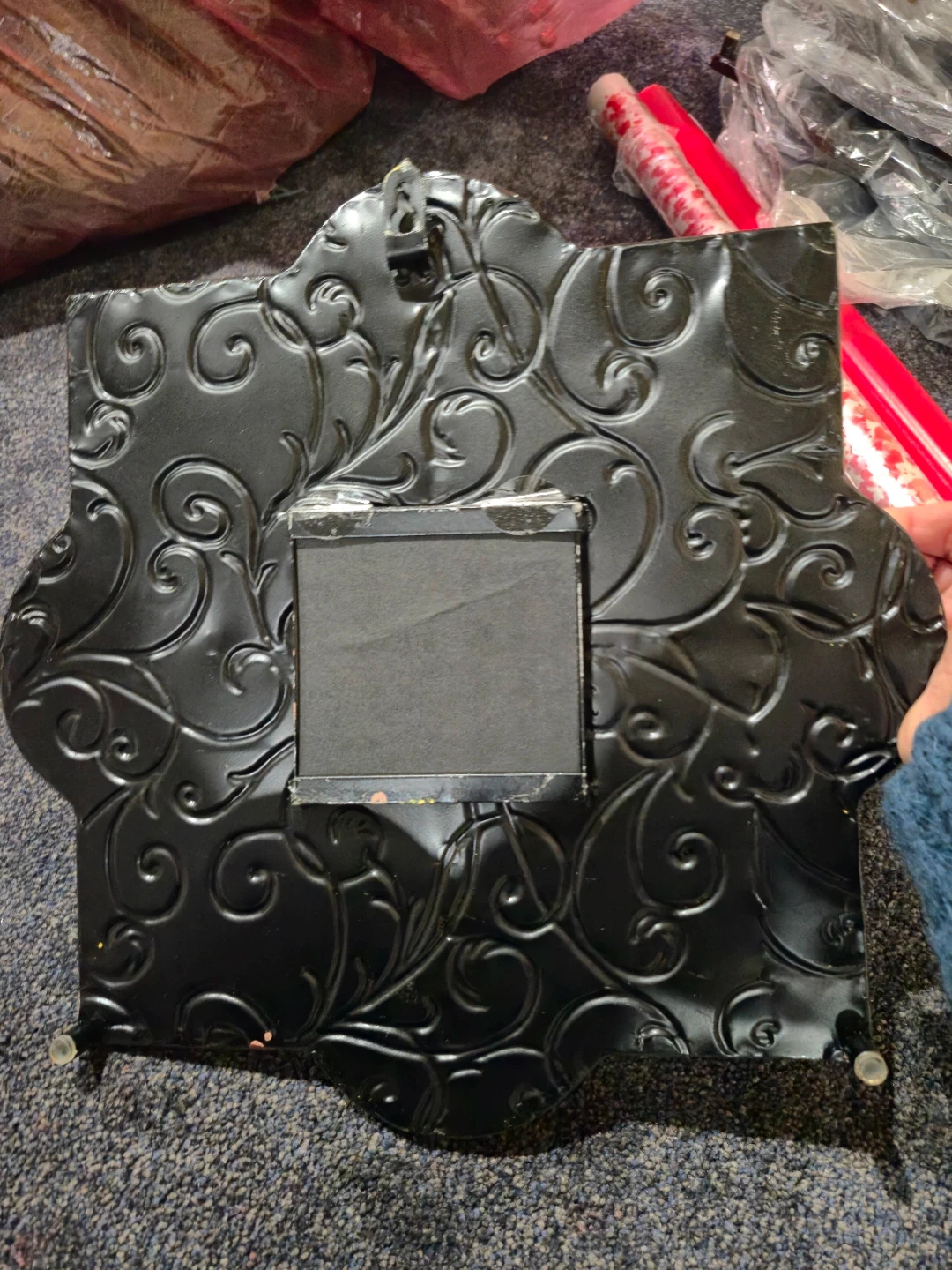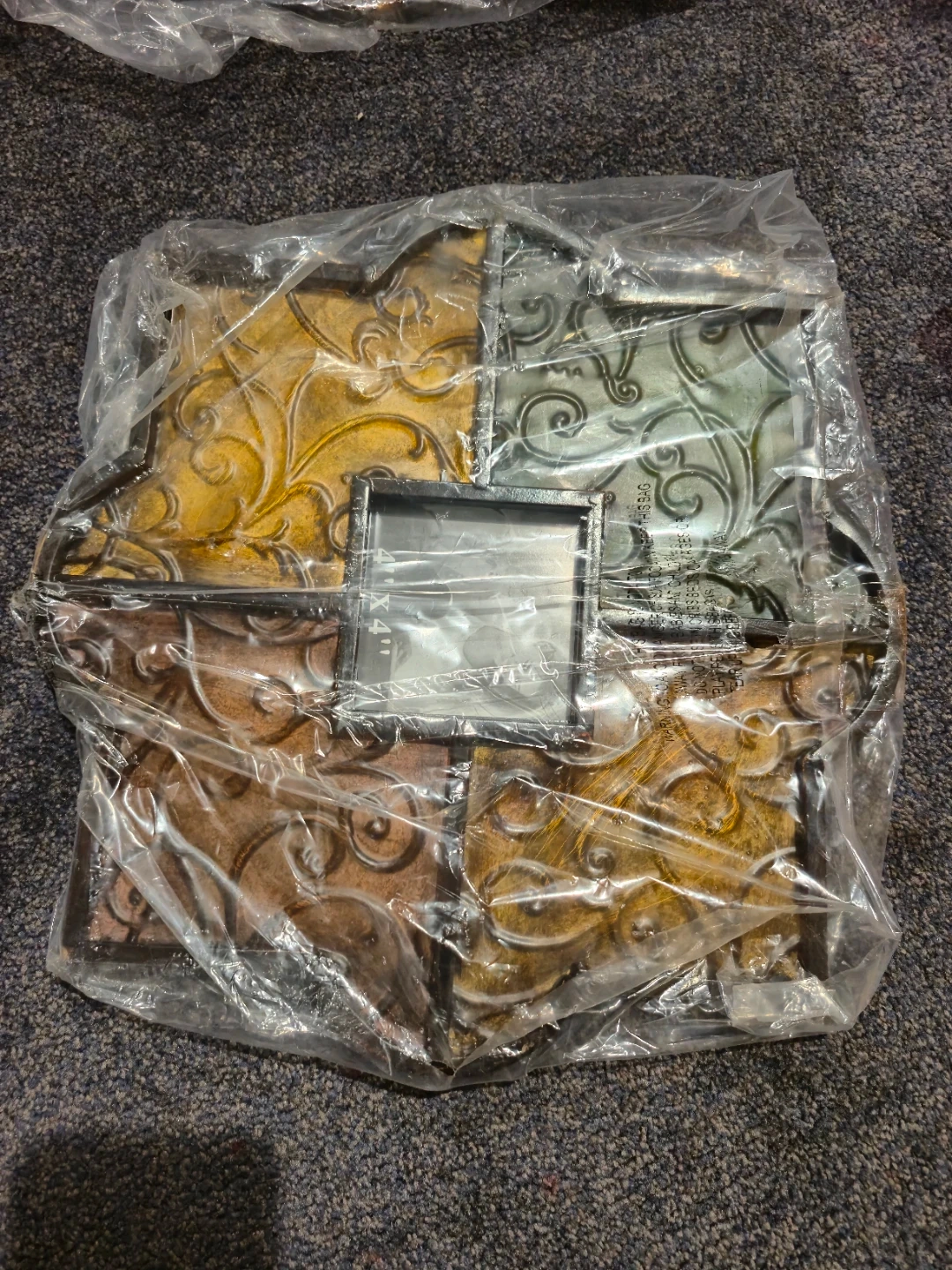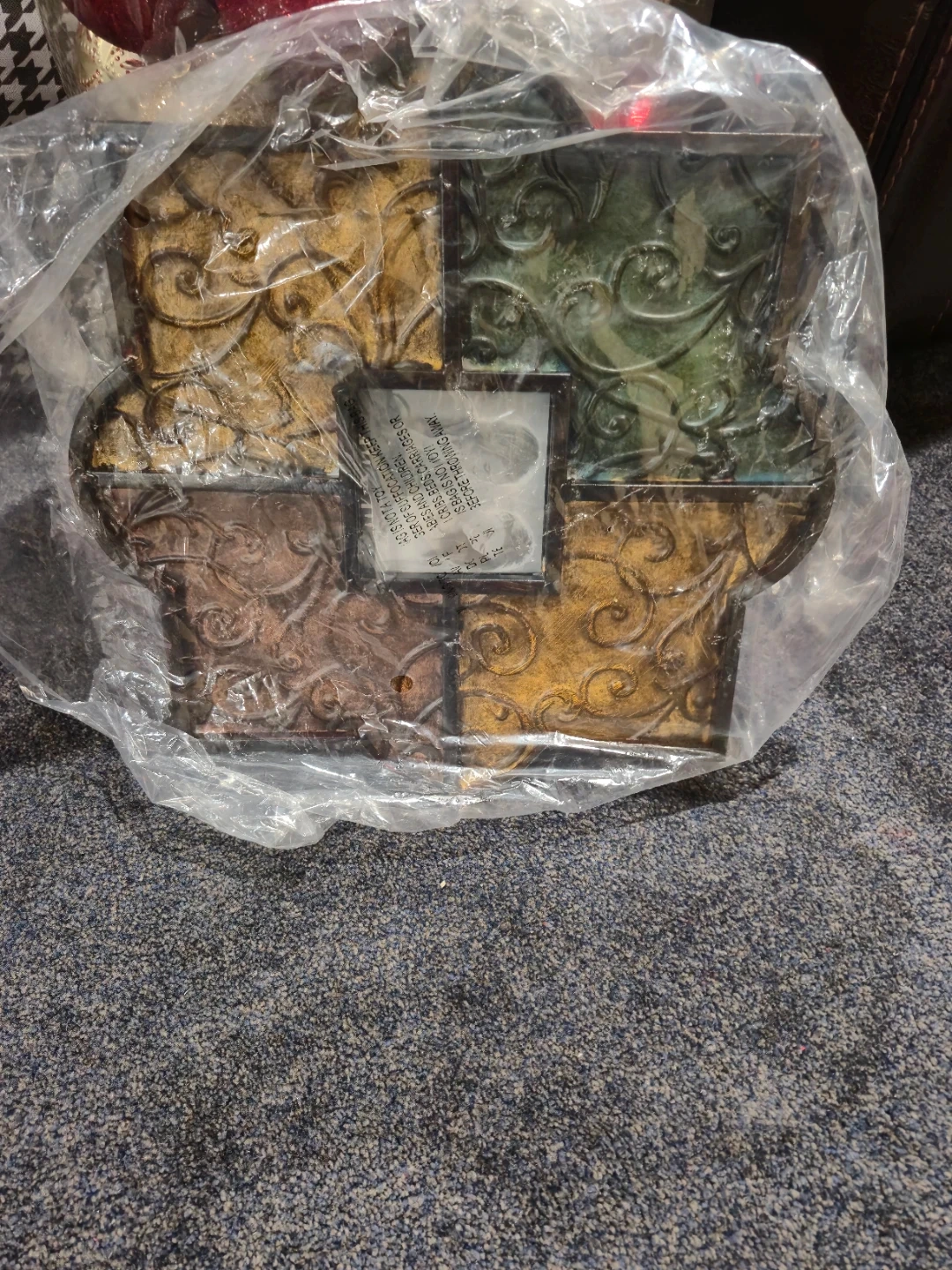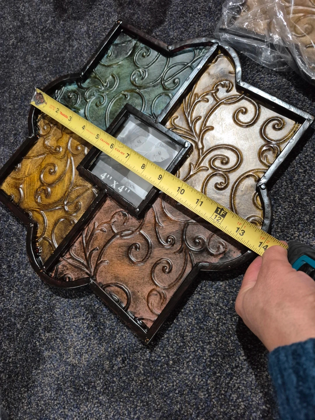 This is a decorative metal photo frame that holds a 4"x4" photo. It has a unique design with a floral pattern and a multi-tone finish.