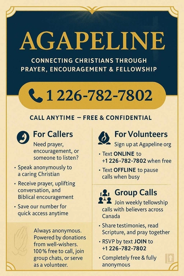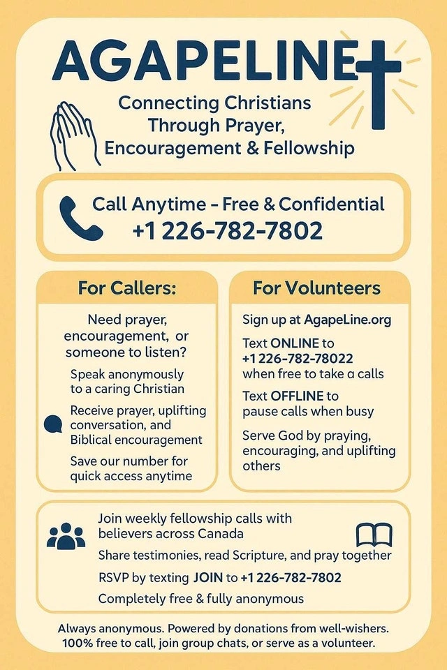 Okay i built this whole system, it works and i believe can have a tremendous impact. Check it out at agapeline.org. But heres the problem aint got no resources to take this out to the world, no following to jump start it and no knowledge or experience in running a non profit organisation. So if you have any or all of this you are the perfect partner. Text me, i dont bite haha, lets make this happen. If you have a church, are part of a church or know any way of getting this to the world please reach out. Revival starts with you. Maybe you can't help but just like the idea shoot me a message too, even if you are a critic I wanna hear that feedback don't hold back. Are you passionate about connecting Christians across Canada through prayer, encouragement, and fellowship? Agapeline needs partners to share testimonies, read scripture, and pray together. Join our weekly fellowship calls and help us serve God by uplifting others. It's completely free, fully anonymous, and powered by donations from well-wishers. If this advertisement is still live, the opportunity is available—because faith and good deeds never expire!