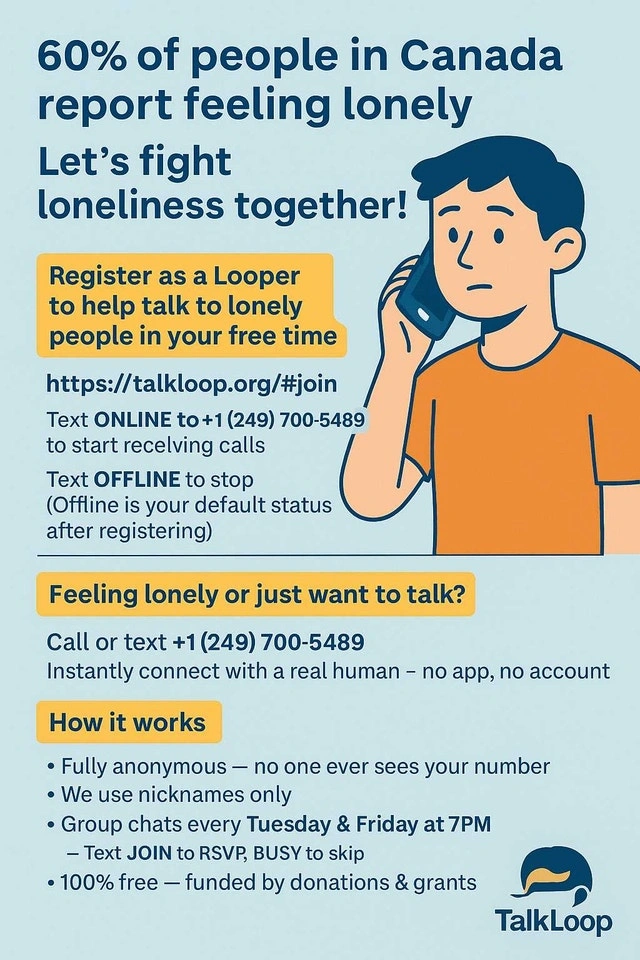 I am looking for a partner to help eradicate the loneliness epidemic through talkloop. I want to start this nonsense profit but have little to no knowledge on running one. So if you are out there and are passionate about the cause and have knowledge and or experience in running Non profits please contact me and lets take this to the world. It's a good system I built and still upgrading. I believe that it can have an impact in Canada. If you want to know more about it please message me. Here's a sample partnership email I sent to genwell for you to have an idea on how the system works. My name is [Your Name], founder of TalkLoop — a Canadian initiative born out of my own experience with loneliness as a student and growing awareness that many more quietly suffer the same. TalkLoop is a free, phone-based connection system built to reduce isolation and strengthen human connection—without requiring apps, internet, or accounts. How TalkLoop Works Anyone across Canada can simply dial our number: +1 (249) 700-5489. Upon calling, the user is guided via keypad to choose a category: press 1 for “Talk to a Student”, 2 for “Talk to an Elder”, 3 for “Random Chat”, 4 for “Crisis Support”, and 0 for “Talk to our AI Buddy”. Real people (“Loopers”) sign up via our website to volunteer. They text ONLINE when they’re available and OFFLINE when they are not. The system only connects callers to Loopers who are currently online. The system ensures complete anonymity: no user phone numbers are disclosed, calls are routed via our infrastructure. After each one-on-one call, both parties can leave a rating. Anyone receiving three consecutive low-ratings is automatically banned, protecting the community experience. (Internal system rule) We also incorporate real-time monitoring: our system uses a “whisper” AI filter to detect and immediately block calls with disrespectful language or violation of our terms. (Internal rule) For callers who are in crisis or identified as needing more support, the system can redirect them to emergency resources. (Internal rule) Group chats: Twice weekly (Tuesdays & Fridays at 7:00 PM) we host anonymous group voice-calls. Loopers RSVP by texting JOIN (or BUSY to opt out). Five minutes before the session the system auto-dials all RSVP’d Loopers. We also limit calls for each Looper to a maximum of 5 one-on-one calls per day, to prevent fatigue or spamming and maintain quality. (Internal rule) We provide study materials on our website for Loopers: training on how to engage kindly, how to listen well, how to help callers feel connected. We also display our Privacy Policy and Terms of Use clearly to set expectations. (Internal rule) My story: I created TalkLoop while still a student after seeing how loneliness affected me and so many around me. The idea was simple: what if anyone, anytime, could call a number and talk to someone who cares? I lacked resources and influence to scale it alone, which is why I’m reaching out now to organizations like GenWell. Why We’re Reaching Out to GenWell Your mission to build a more connected Canada through programs and partnerships aligns perfectly with TalkLoop’s aim. While GenWell leads the movement at a policy/education/awareness level, TalkLoop provides a tangible, operational solution—the voice-connection service people can use right now. Together we can bridge awareness and action. Proposed Collaboration Incorporate TalkLoop into GenWell’s “Community Partner” network: link to our service as a recommended resource for isolated or lonely individuals. Co-promote campaigns (“#MakeAConnection”, “One Call Can Change ALot”) leveraging both platforms. Share and analyse de-identified data/feedback from TalkLoop (subject to privacy limits) to inform your research and public-education resources. Participate in your podcast, webinars or conference with sections on direct peer-connection solutions & scaling human voice-based services. Pilot a special campaign targeted at a specific demographic (e.g., s