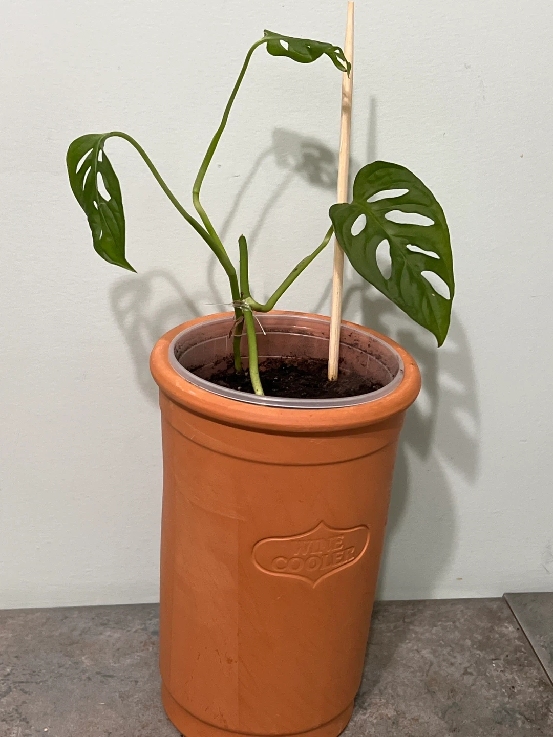 Selling a healthy Monstera Adansonii plant! It's potted in a unique 'Wine Cooler' pot and comes with a support stick. Perfect for adding a touch of greenery to your home