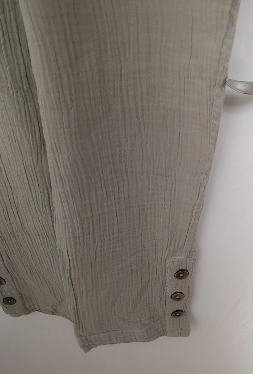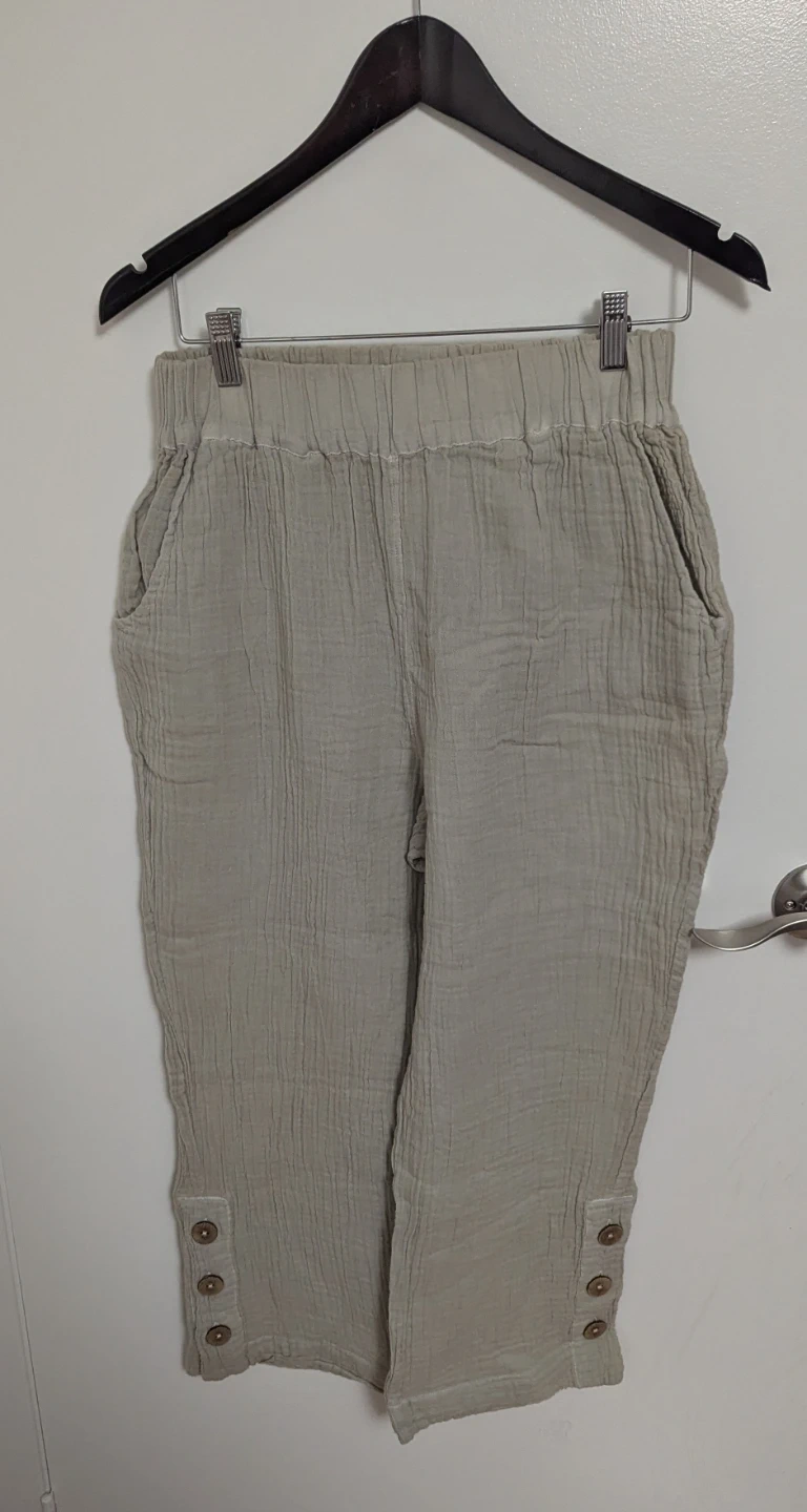 These are The Post Office Sandy Crop Pants in Chalk, size small. They feature a comfortable elastic waistband and button details at the hem. Originally bought for $99