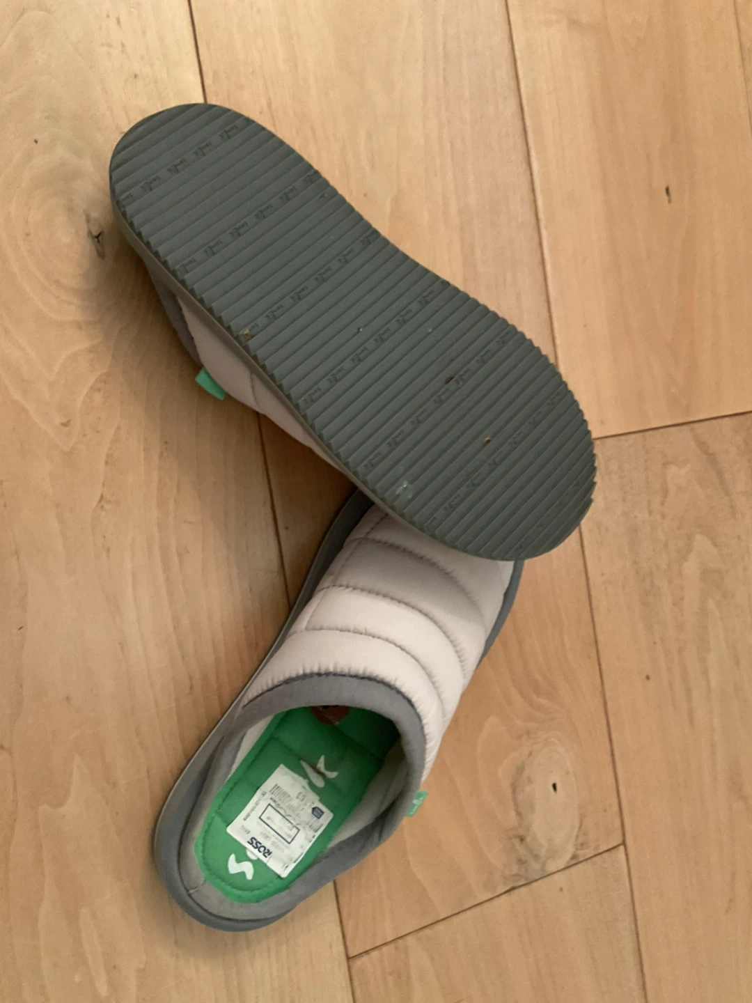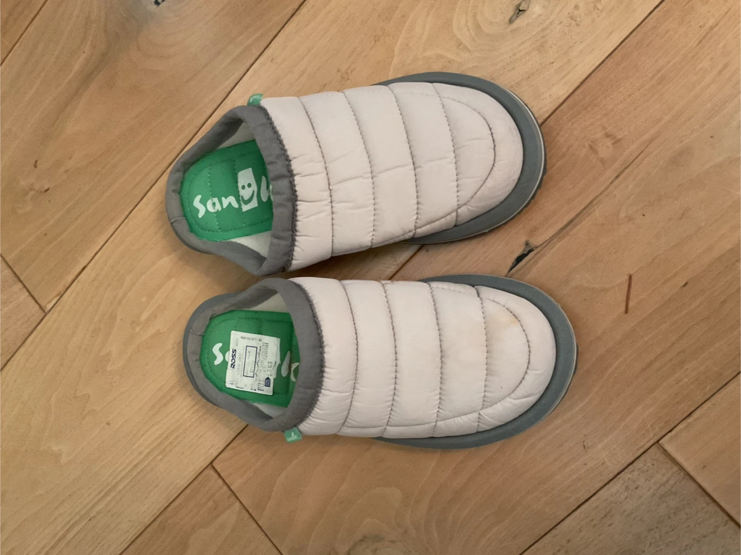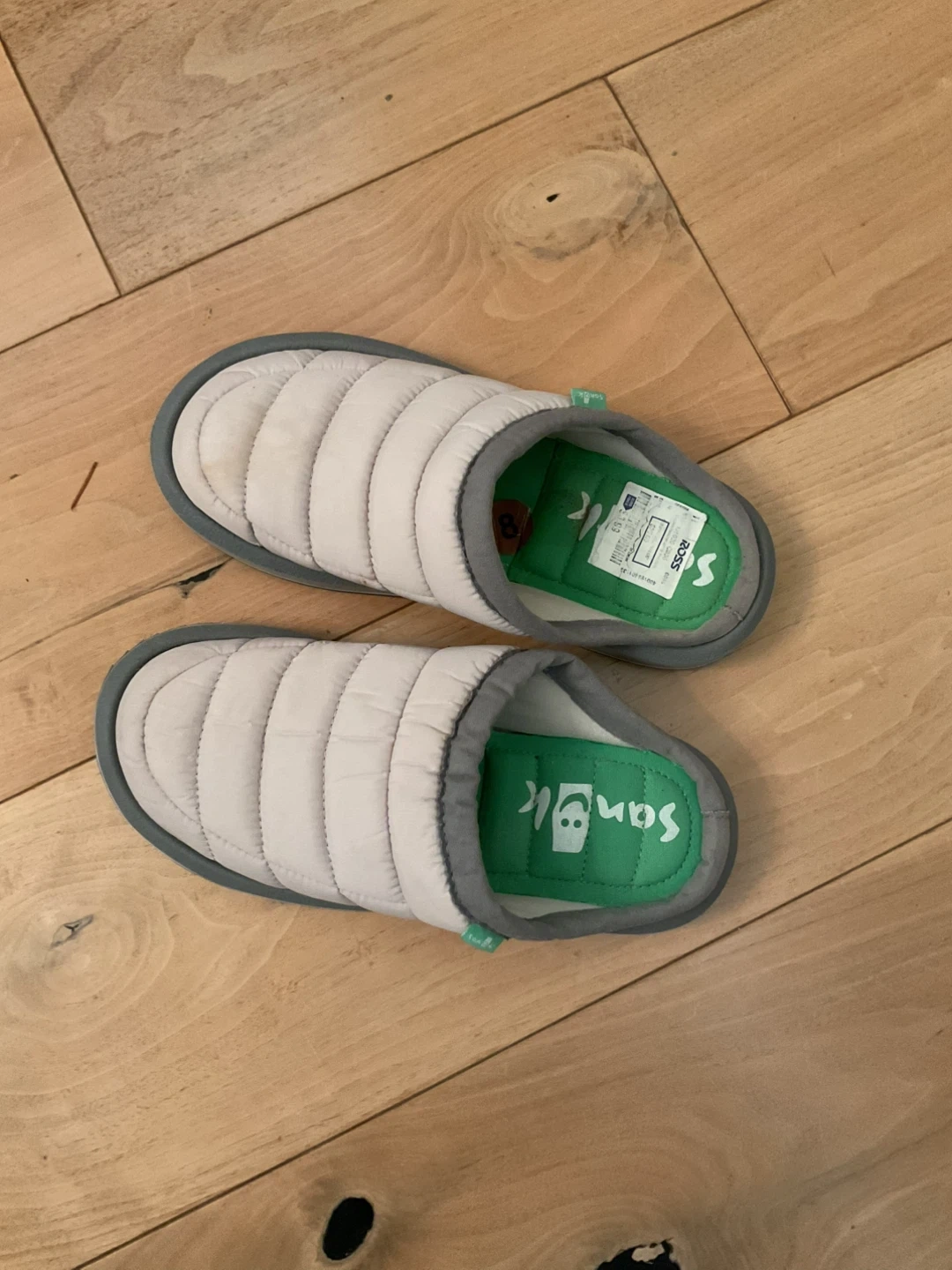 Selling a pair of Sanuk Cozy Vibe Sm slippers in women's size 8. They are a light colour with grey trim and a green insole. They are in great condition and ready for a new home!