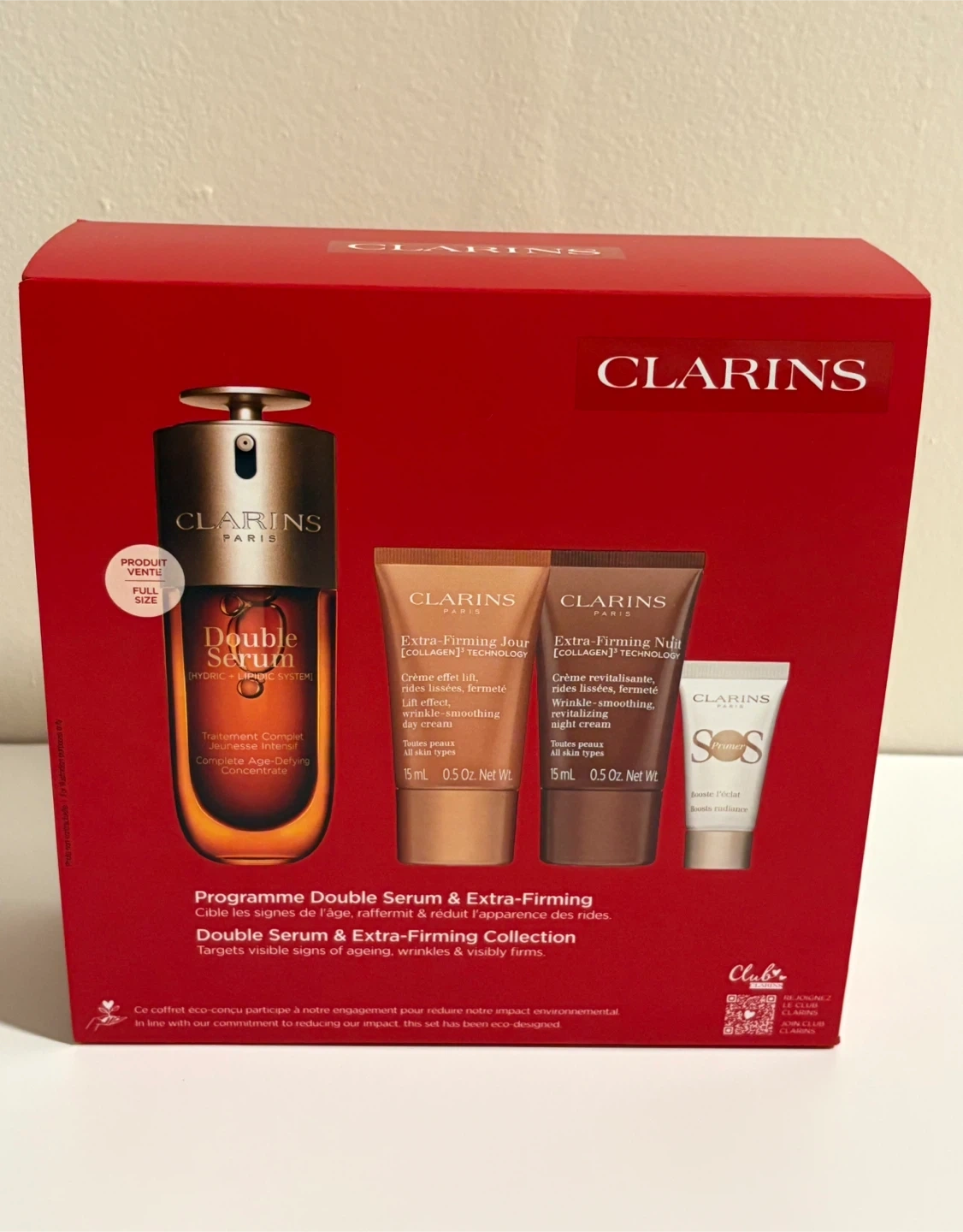 Selling a Clarins Double Serum & Extra-Firming Collection set! This set targets visible signs of aging, wrinkles, and visibly firms the skin.
