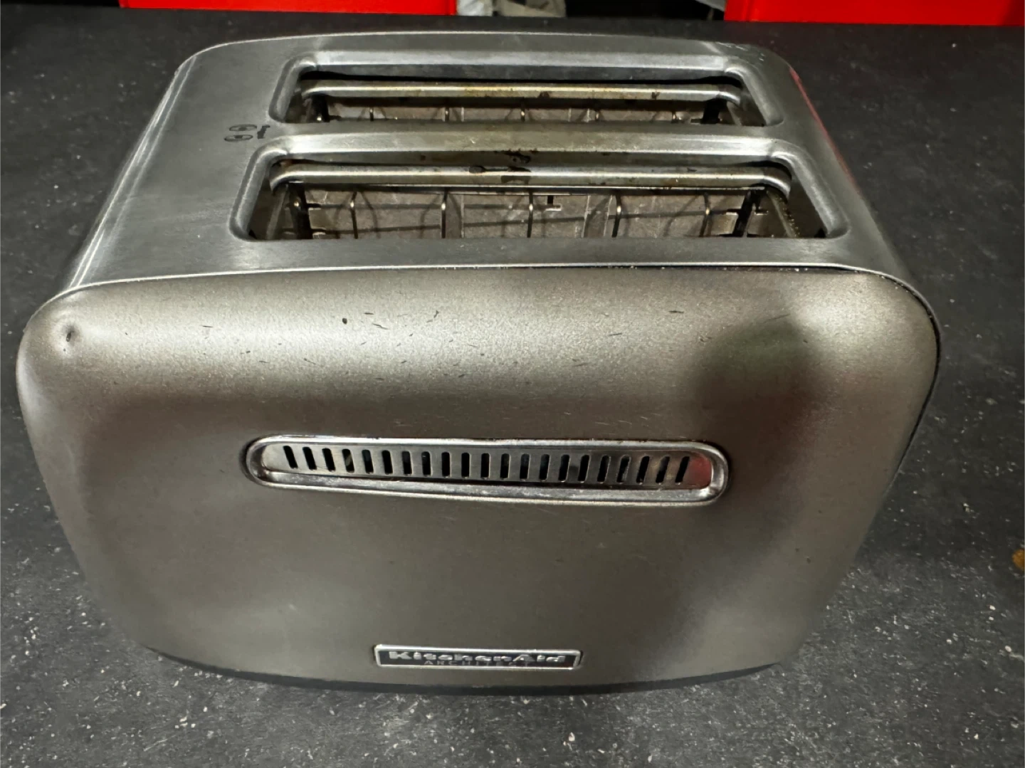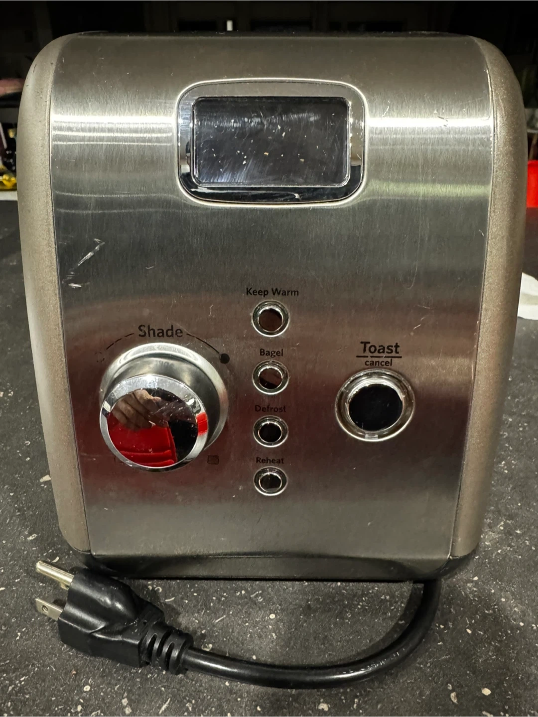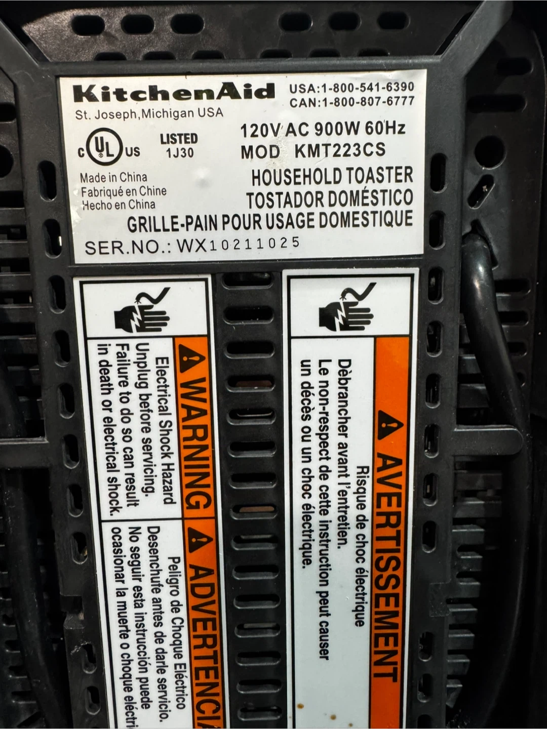 Selling a KitchenAid household toaster, model KMT223CS. It has settings for keep warm, bagel, defrost, and reheat. It's a 120V AC 900W 60Hz toaster.