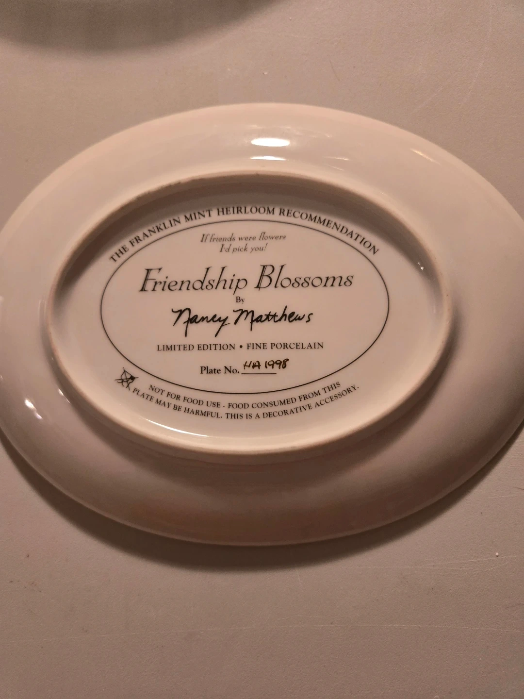 This is a limited edition fine porcelain plate from The Franklin Mint Heirloom Recommendation series, titled "Friendship Blossoms" by Nancy Matthews. The plate features an adorable image of kittens surrounded by flowers. Plate number is HA 1998. Please note that this is a decorative accessory and not for food use